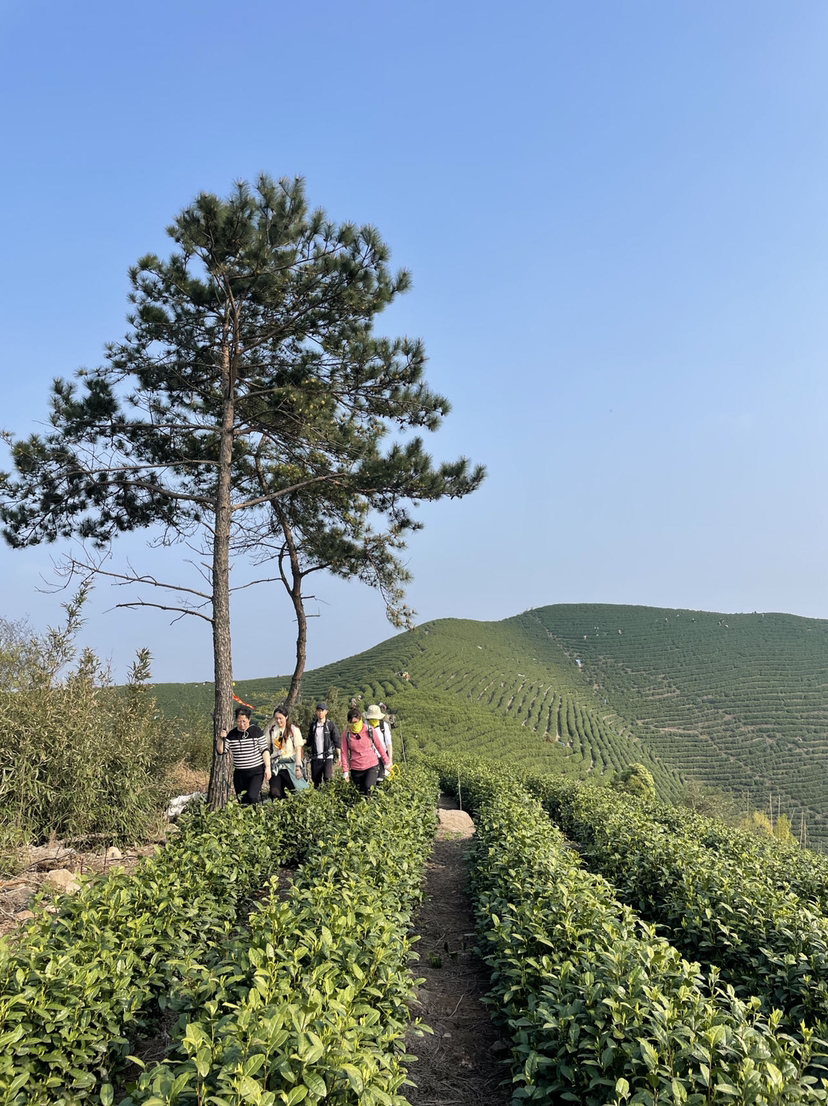 小伙伴们在景区赏花赏景,同时稍作休息享用路餐,为下午的茶田漫步养精蓄锐。下午1:45,大队伍准时向茶山出发。茶田路段以土路为主,小伙伴们在茶田里穿行。