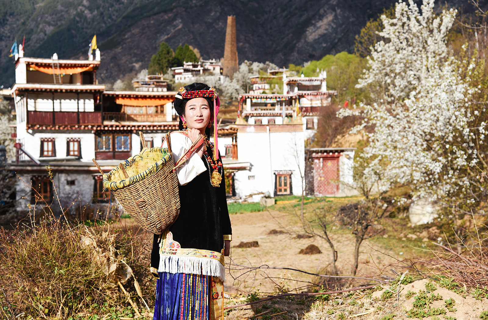 中路的梨树高大,花朵密集,散落在独具特色的嘉绒藏族民居和藏寨碉楼附近