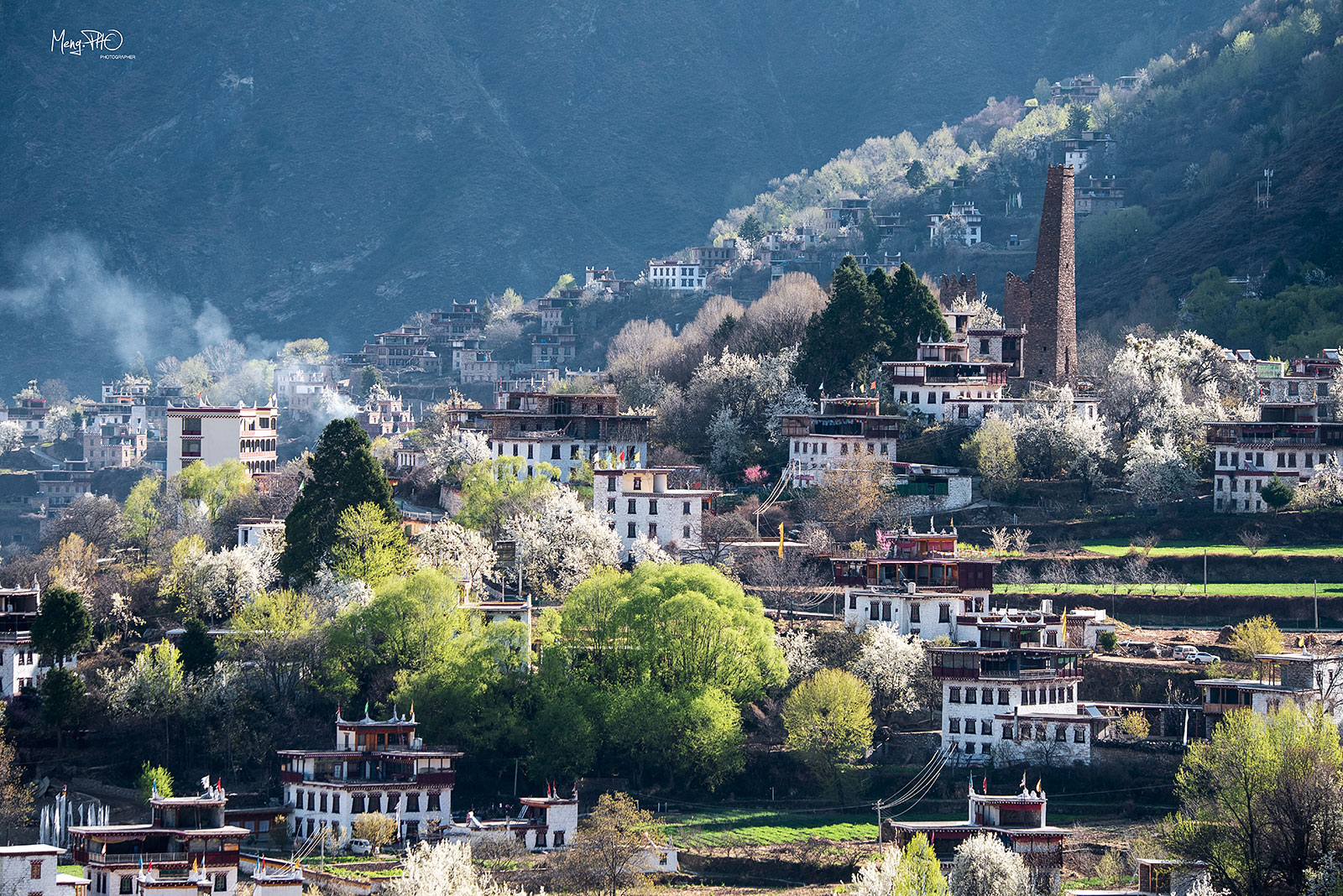 碉楼、藏寨、梨花沐浴在清晨的阳光之下