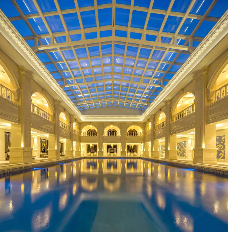 这次我们是首发团,在领队草药的带领下提前做了大量工作,其中了解到,因为我们入住的是旗下的子酒店,所以我们的小伙伴是可以拿着酒店房卡沿途去到对面的五星级酒店享受星级娱乐服务,由于整个园区都很大,所以可以通知前台准备接驳车(免费),接着我们的小伙伴去享受对面的星级服务,于是在领队草药的带领下,我们坐上接驳车前往五星级酒店,小伙伴们进入大堂,小伙伴们都非常欣喜,哇!不愧是五星级酒店,金碧辉煌、富丽堂皇;大理石的台阶,名贵的地毯、玉制的石像,一切极尽奢华之至!酒店娱乐设施非常丰富。冬天有温泉,此外还有一系列高端运动设备:网球场、篮球场、羽毛球场、乒乓球室、台球室、健身房以及清澈蔚蓝、极其惊艳的宫殿式恒温泳池,小伙伴们如果带了泳衣可以进去畅享运动的乐趣,焕发无限活力。一旁的儿童乐园亦是托家带娃伙伴们的理想选择。这一天实在是拥有了太多开心、惊奇、幸福且非常充实的一天,小伙伴们都觉得,简直不要太爽,哈哈,小编也觉得实在是很棒。就这样在一堆娱乐活动进行完毕后,小伙伴便各回到房间养精蓄锐,为第二天的徒步做准备,领队草药也及时通知大家明早7.15到酒店到一楼吃早餐