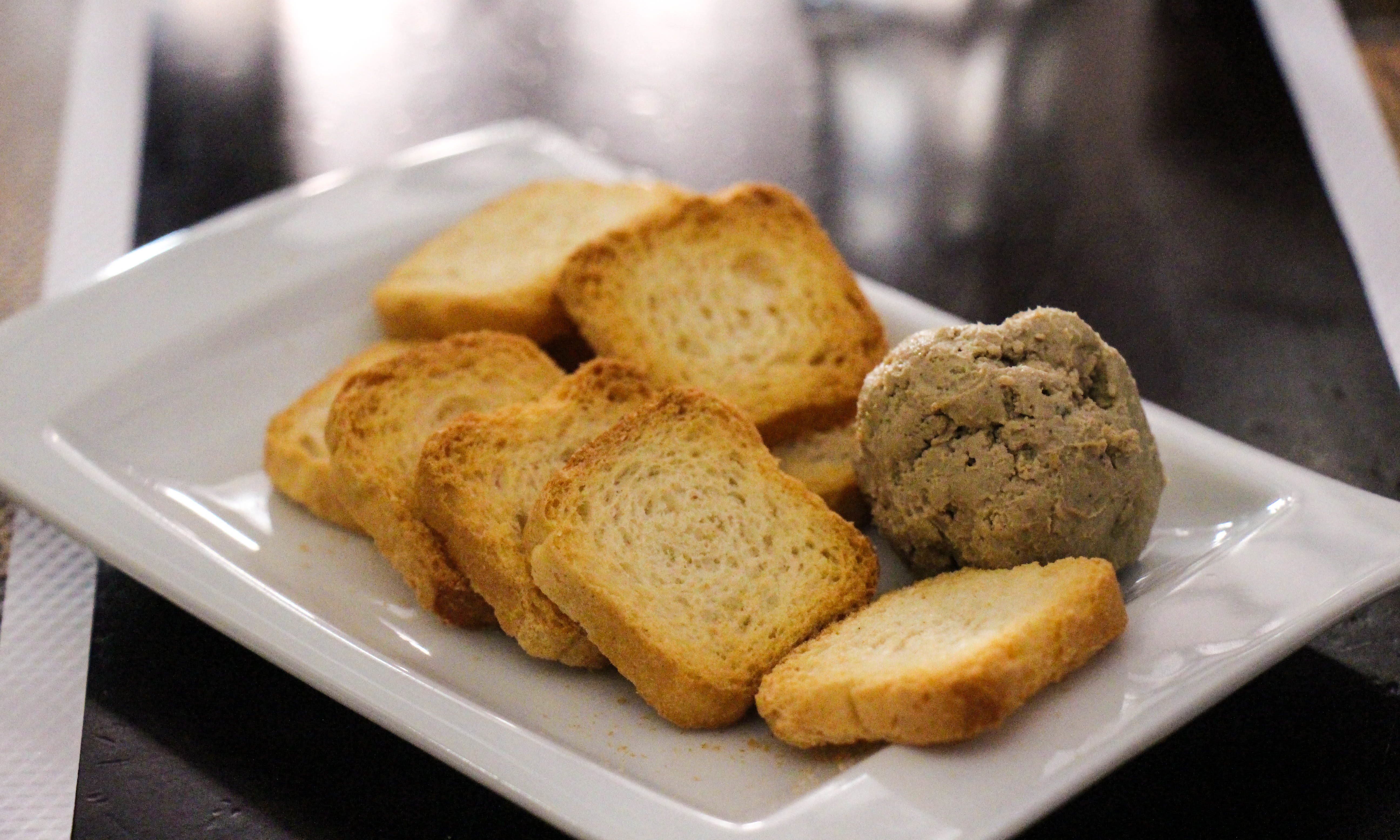 饭馆赠送的小面包片和忘了什么肉做成的酱
