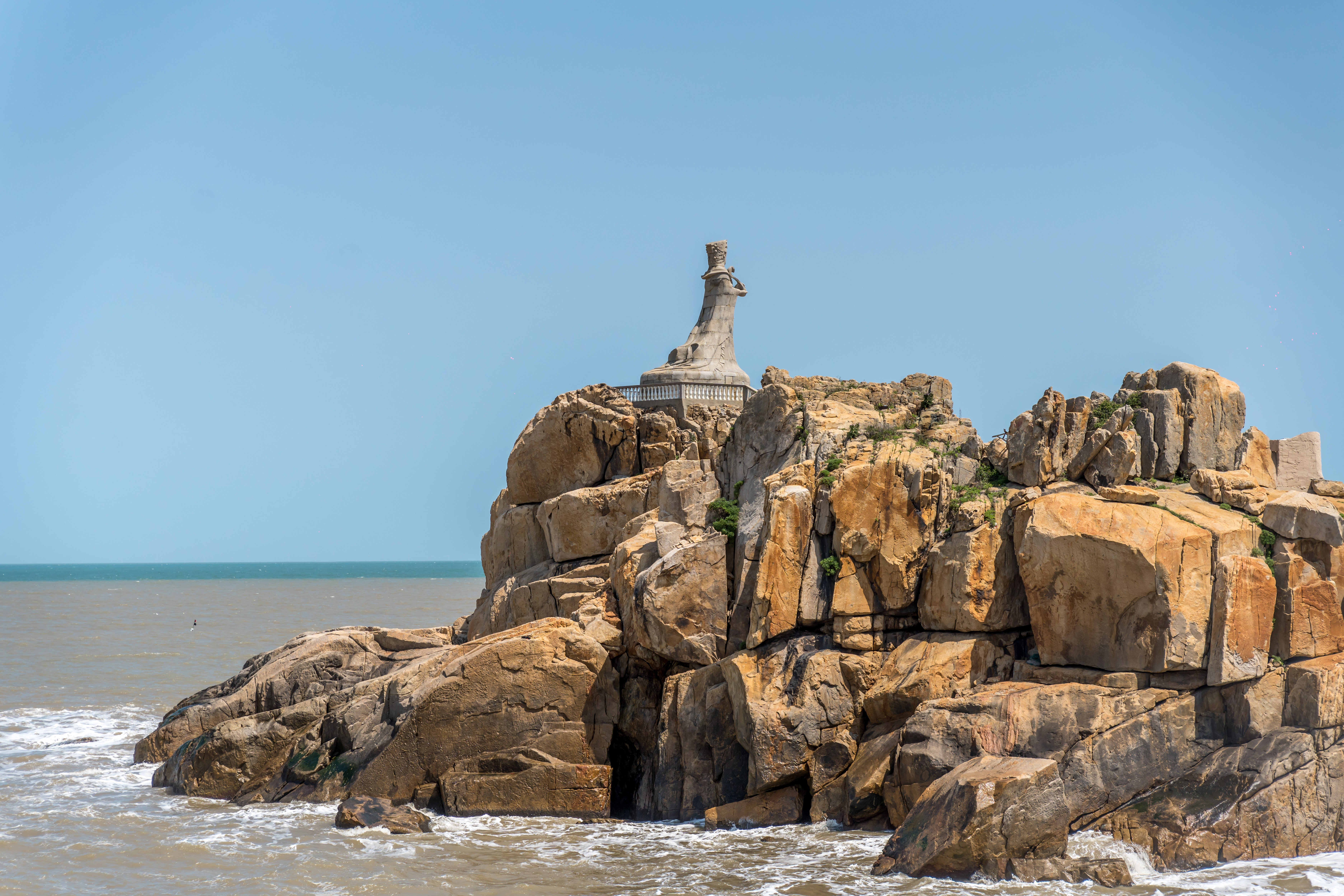 礁石上矗立着8米高的妈祖石雕像,她与莆田湄洲岛,台湾的妈祖石雕像遥遥相望。