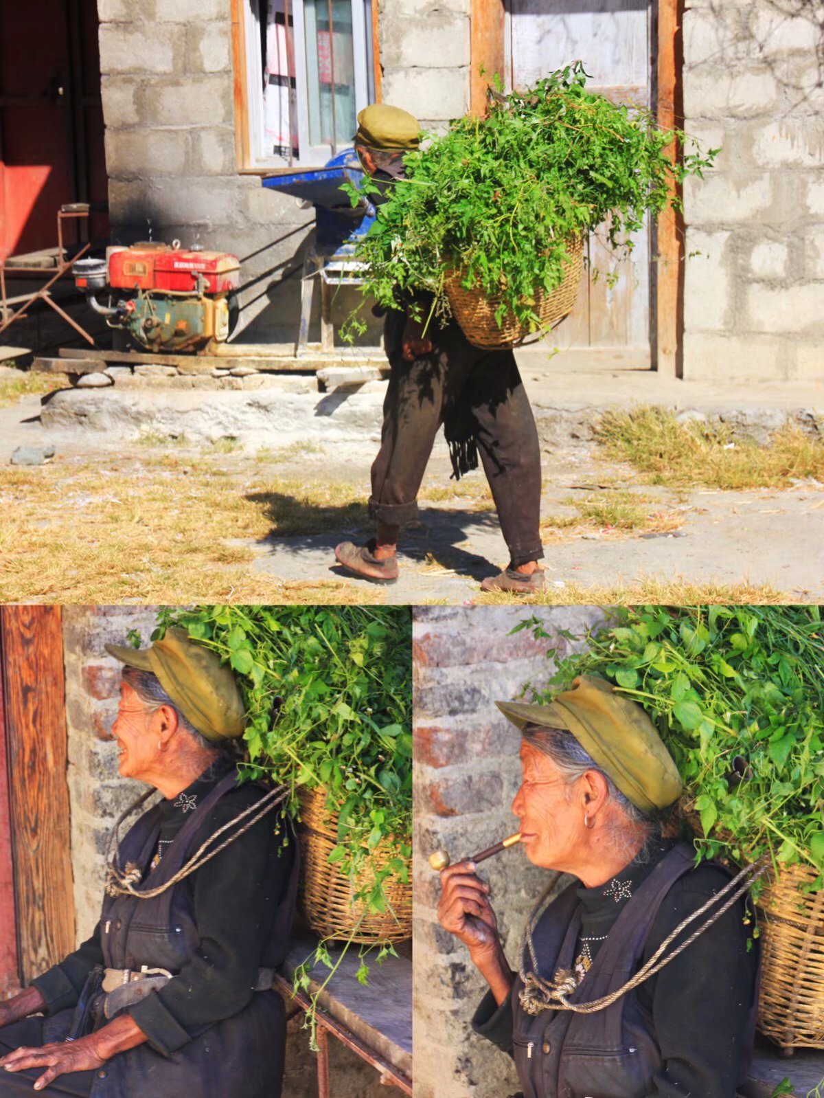 刚入寨子就遇见了一位阿婆,应该是刚上山采的什么草之类的东西背下来。看见我们一群游客,很亲切的对我们笑起来,有几个队友就争相去给她拍照。她也很配合,坐下来抽了一口手中的烟斗。但没想到这阿婆在我们要离开的时候竟然伸出手,作出了讨钱状。我们有点意外,自然是没有理她,转身走掉了。