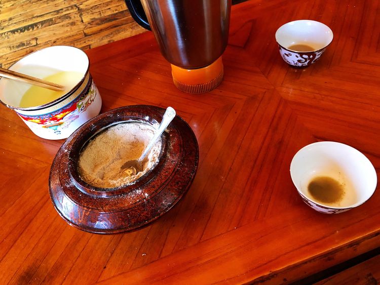 酥油茶、青稞粉,他们家这个酥油茶味道不算很大,我还喝的惯,有点像咸味的奶茶。