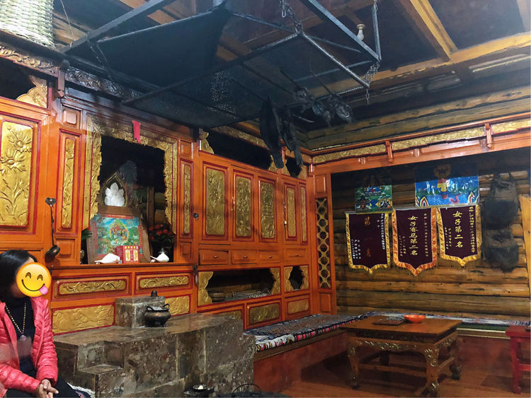 下面这张图是祖母屋,上面有个黑黑的一块东西,看不太出来,其实是鱼。以前的祖母屋里有一盆火是常年都不能灭的,火盆上面挂一条鱼,用下面的烟来熏,熏好了就可以吃。摩梭族这位老师说:“哎呀,这个现在条件好了,其实也并不需要吃那个烟熏出来的鱼了,所以呢,这个鱼其实已经挂了四年了。现在就是用来给你们拍拍照、发发朋友圈。前两天有个游客提出这个鱼太黑了,发完朋友圈都没人能看出来,所以我最近打算换一条,让你们发完朋友圈能看出来。”😂