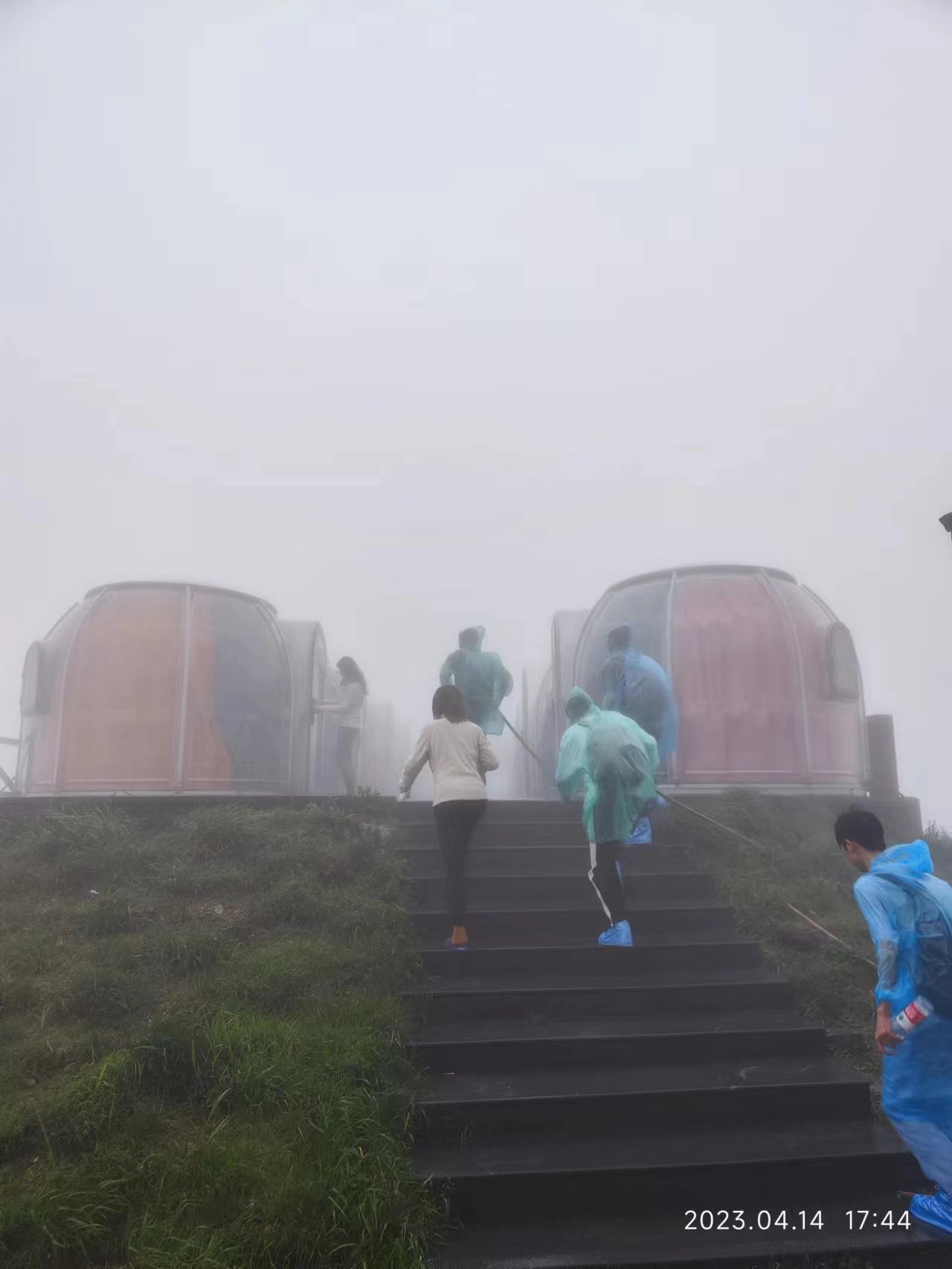 我们拍完照,也从金顶下去,到住宿点,今天住宿是在云之海,住的是类似下图的这种星空帐篷,里面是一张大床,只有一床被子,我去前台问过,加一床被子要50元,还好我带了睡袋,而且房间里还有暖风,晚上也不冷,要不然,两个男生,一床被子,真是的有点儿尴尬,哈哈哈哈哈。