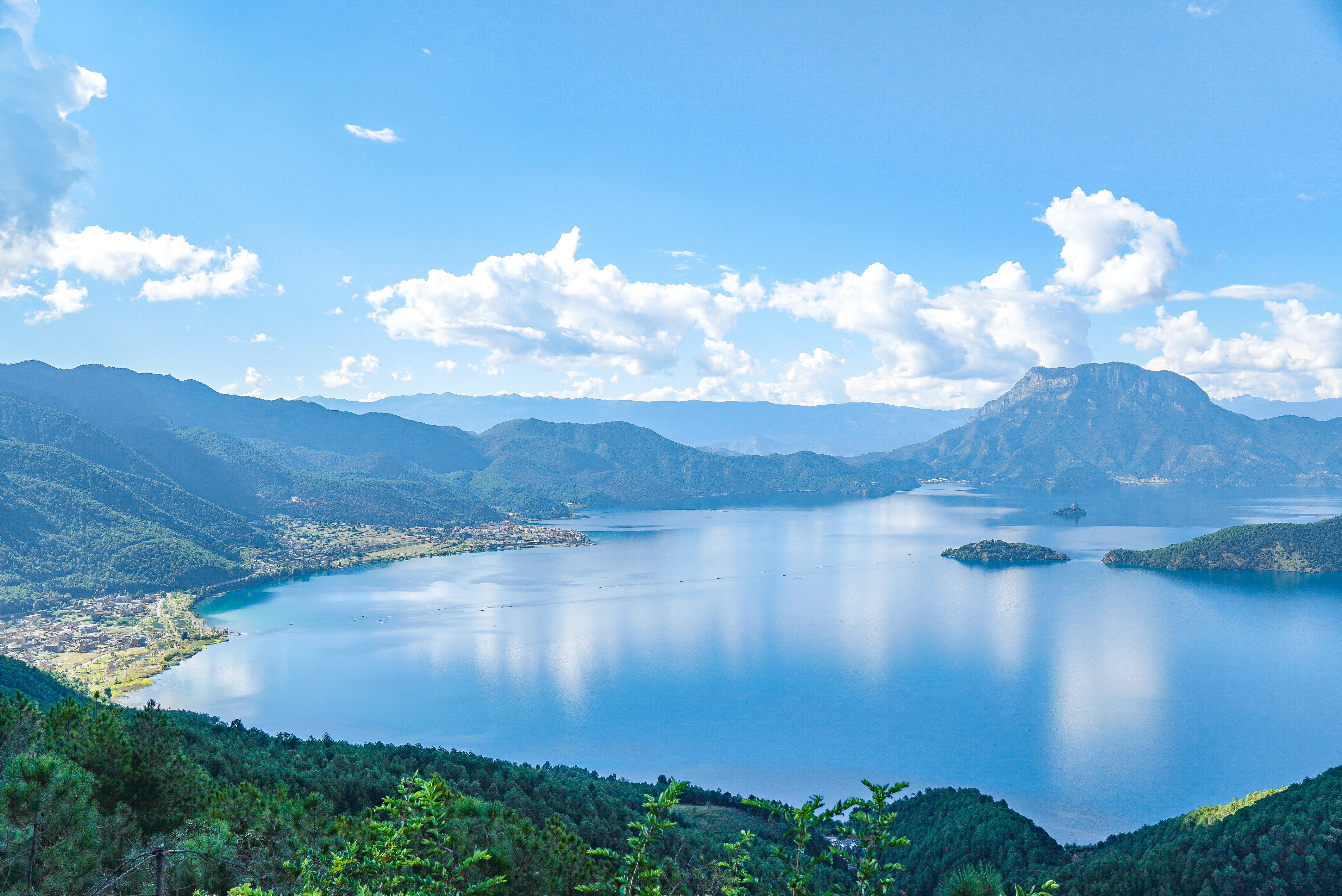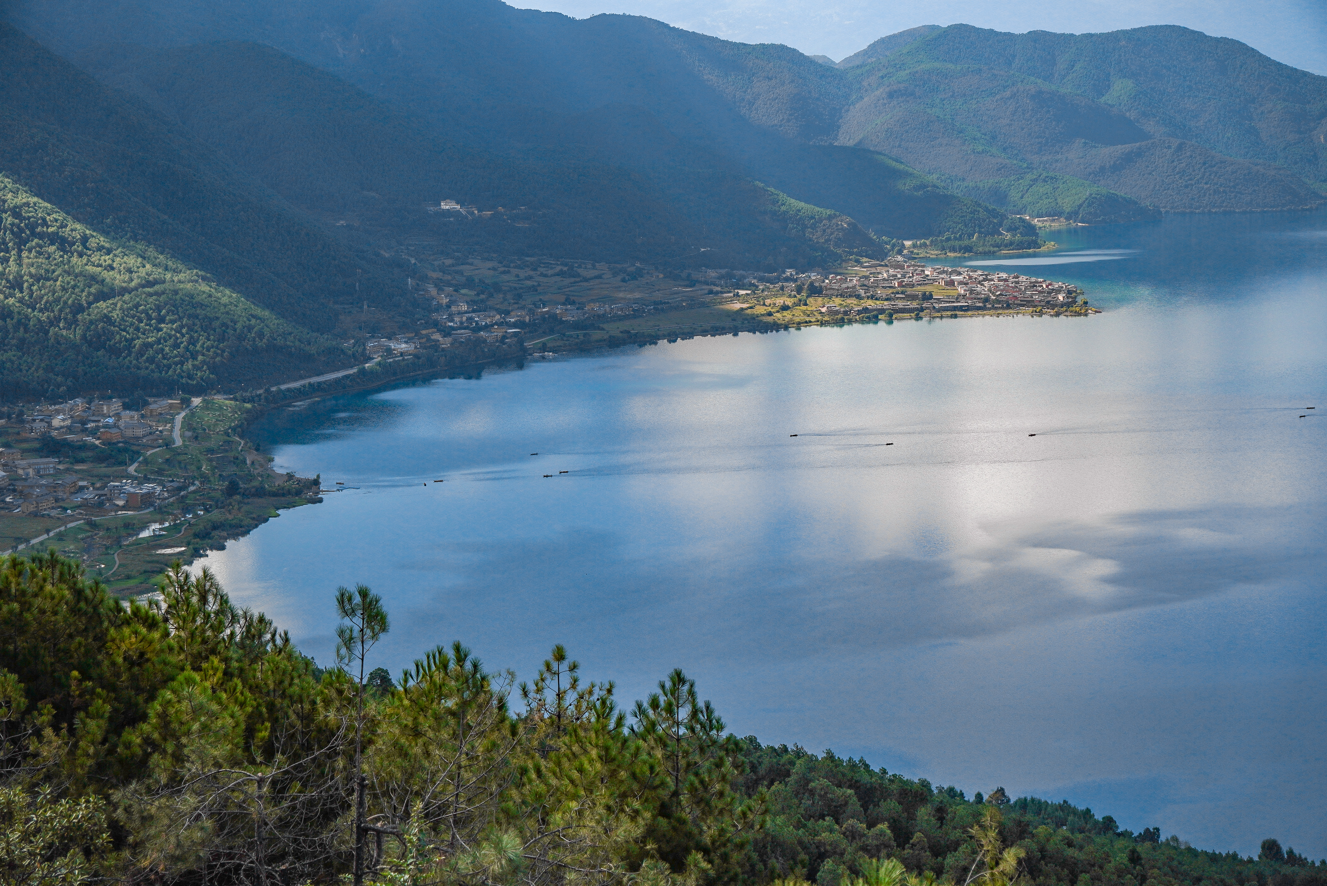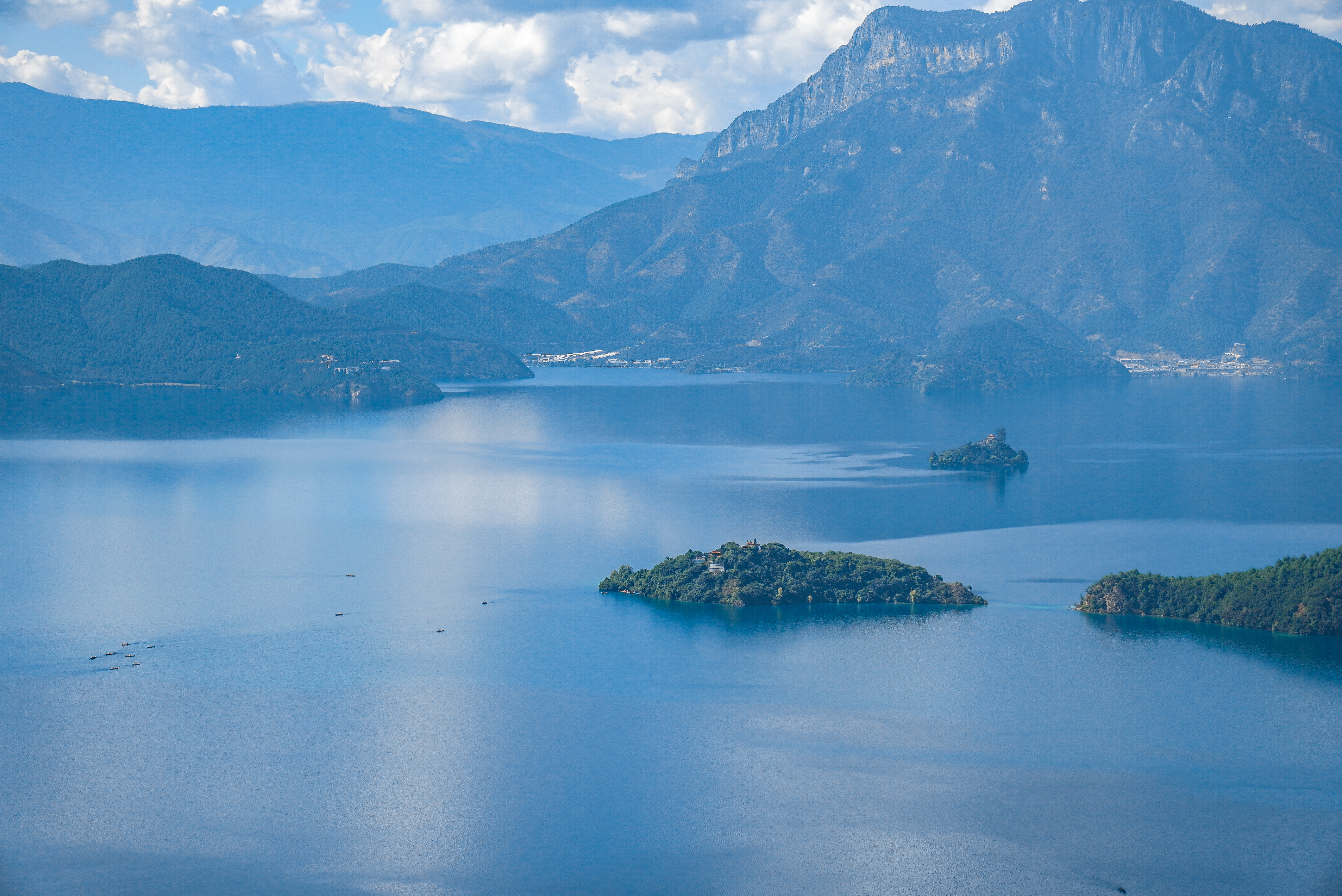 泸沽湖,这个被称为东方女儿国的地方,其实在摩梭语里的意思是“山沟里的湖”,直白简单而不加修饰。在观景台远眺,连绵群山围绕着这一片水波粼粼的湛蓝湖泊,美得是一片极致的纯粹。