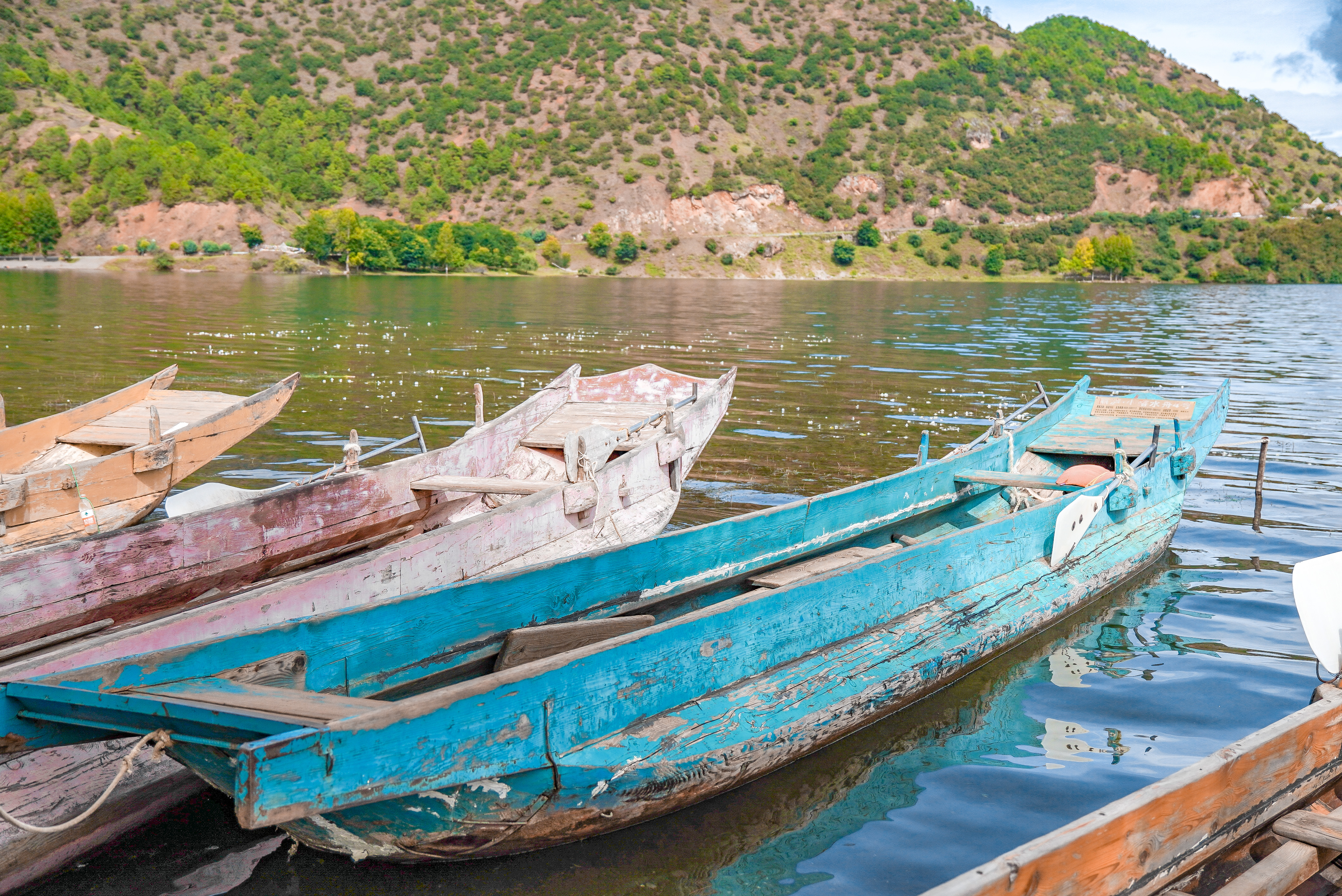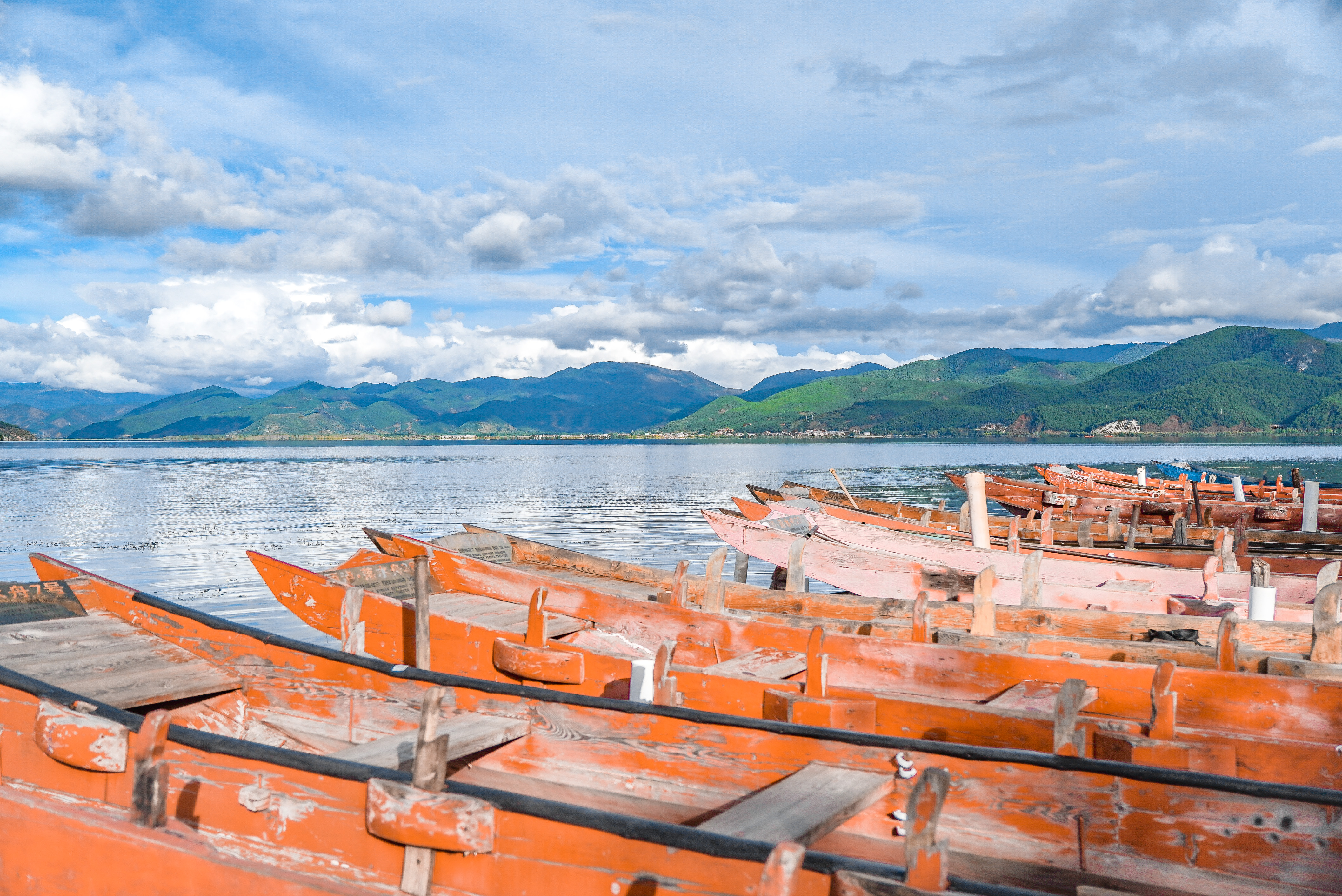这里最有特色的,大概是一排排停靠在码头边的猪槽船了吧!窄长而色彩斑澜的船只在摇曳,与湛蓝的泸沽湖、层峦叠嶂的悠悠青山,组成了一幅幅浪漫的油画,蓝天白云之下,如梦似幻,色彩亮丽得让人驻足不舍得离开。