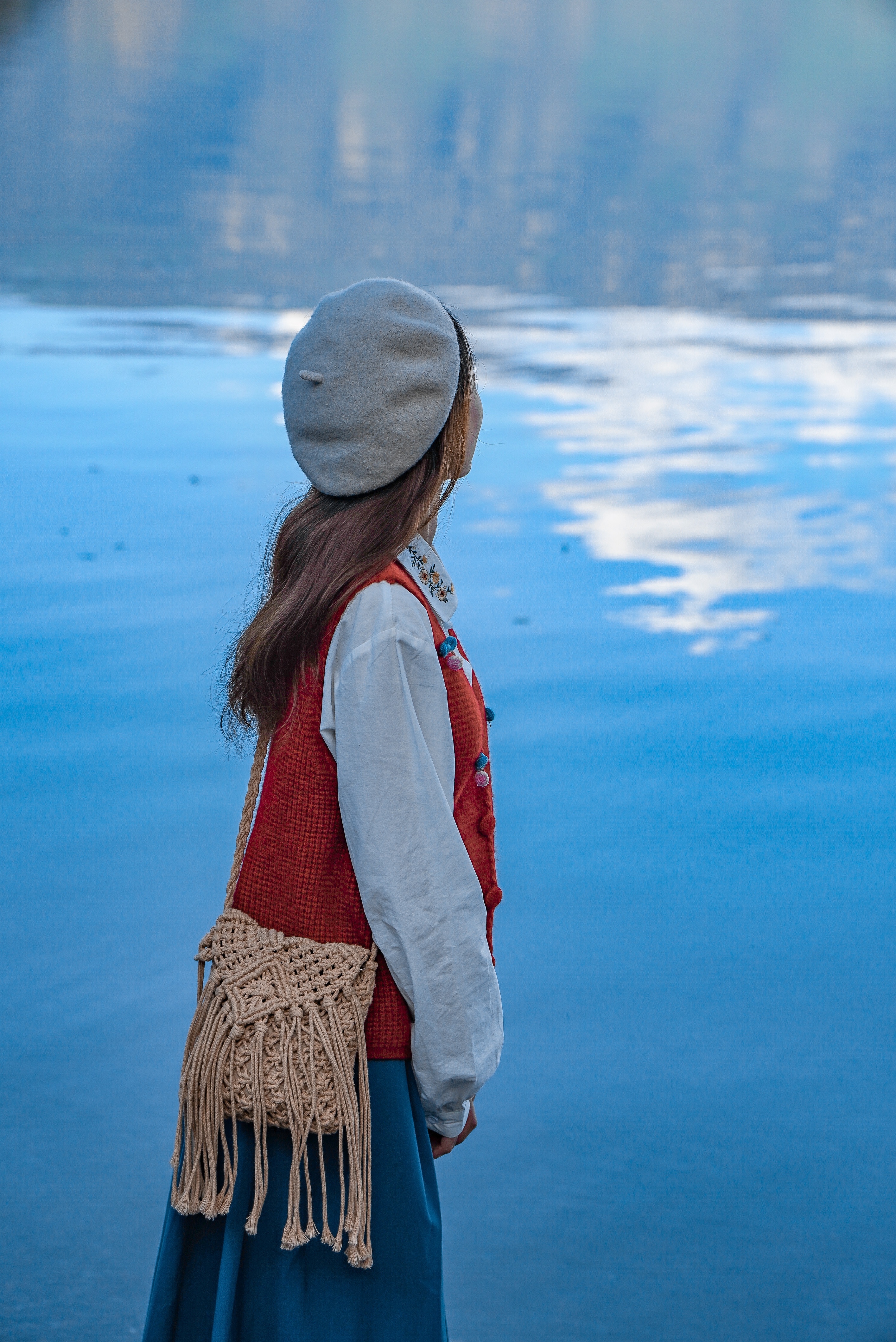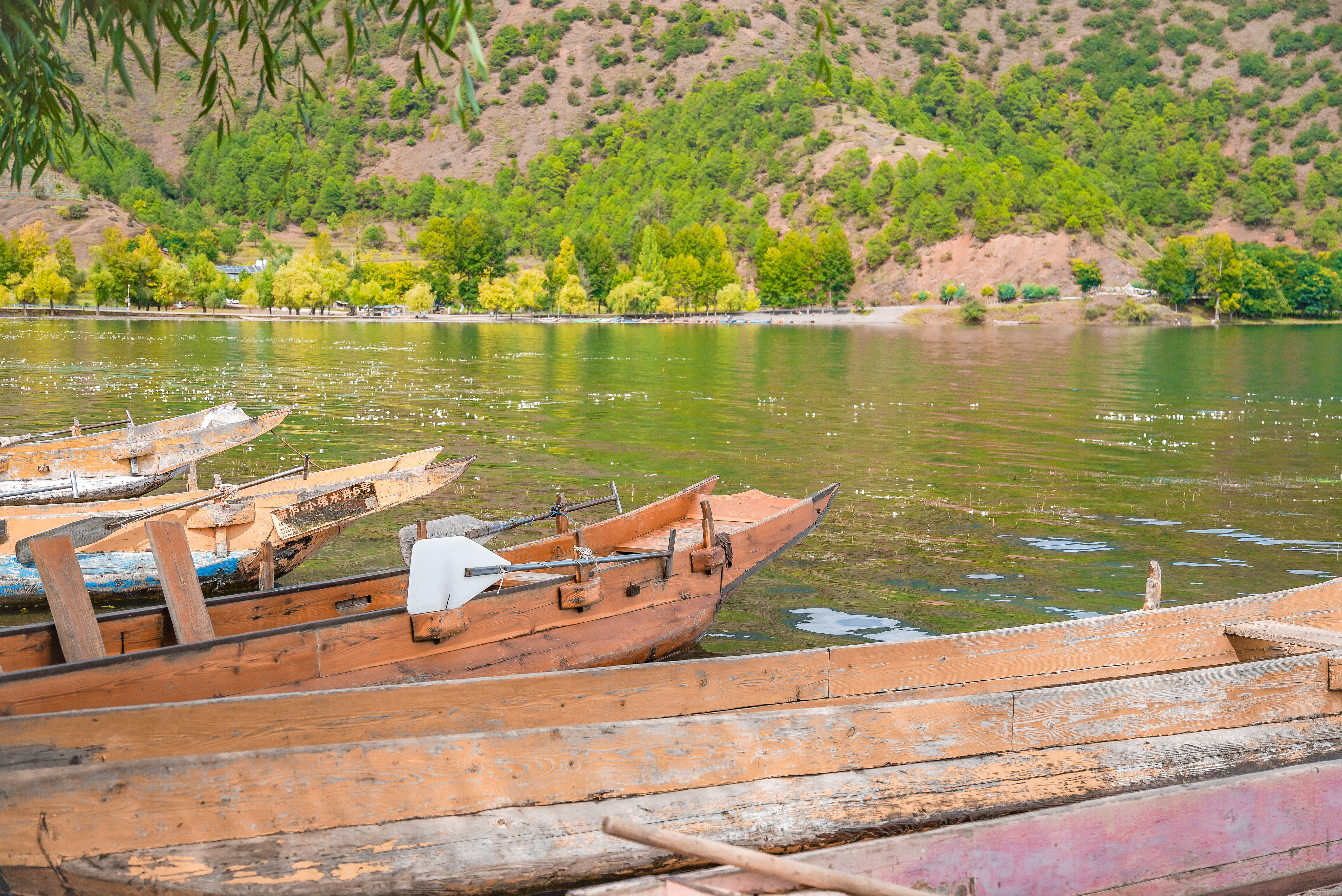 车子停靠在木楞子平房的公路旁,沿着木栈道走进湖边,这个小小的港湾仿佛充满着灵气,远处的格姆女神山清晰可见,蓝天白云之下,湖水如镜面一般,倒映着村落里所有的美好。