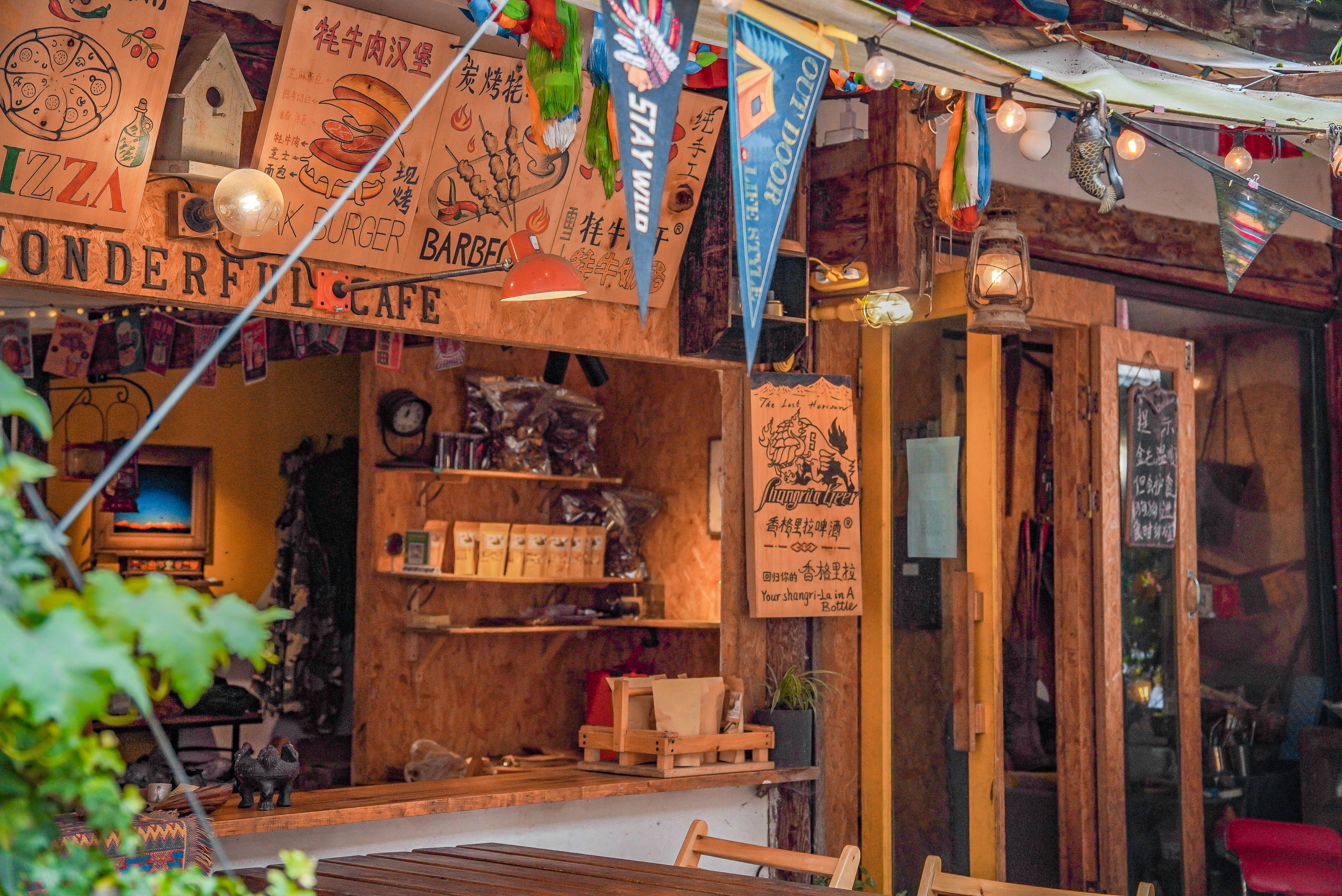 古镇里的小铺子都很有当地特色,无论是扎染店、小酒馆或是民族服装店,都值得慢逛细看,每家每户都养着狗狗看店,惬意得很。