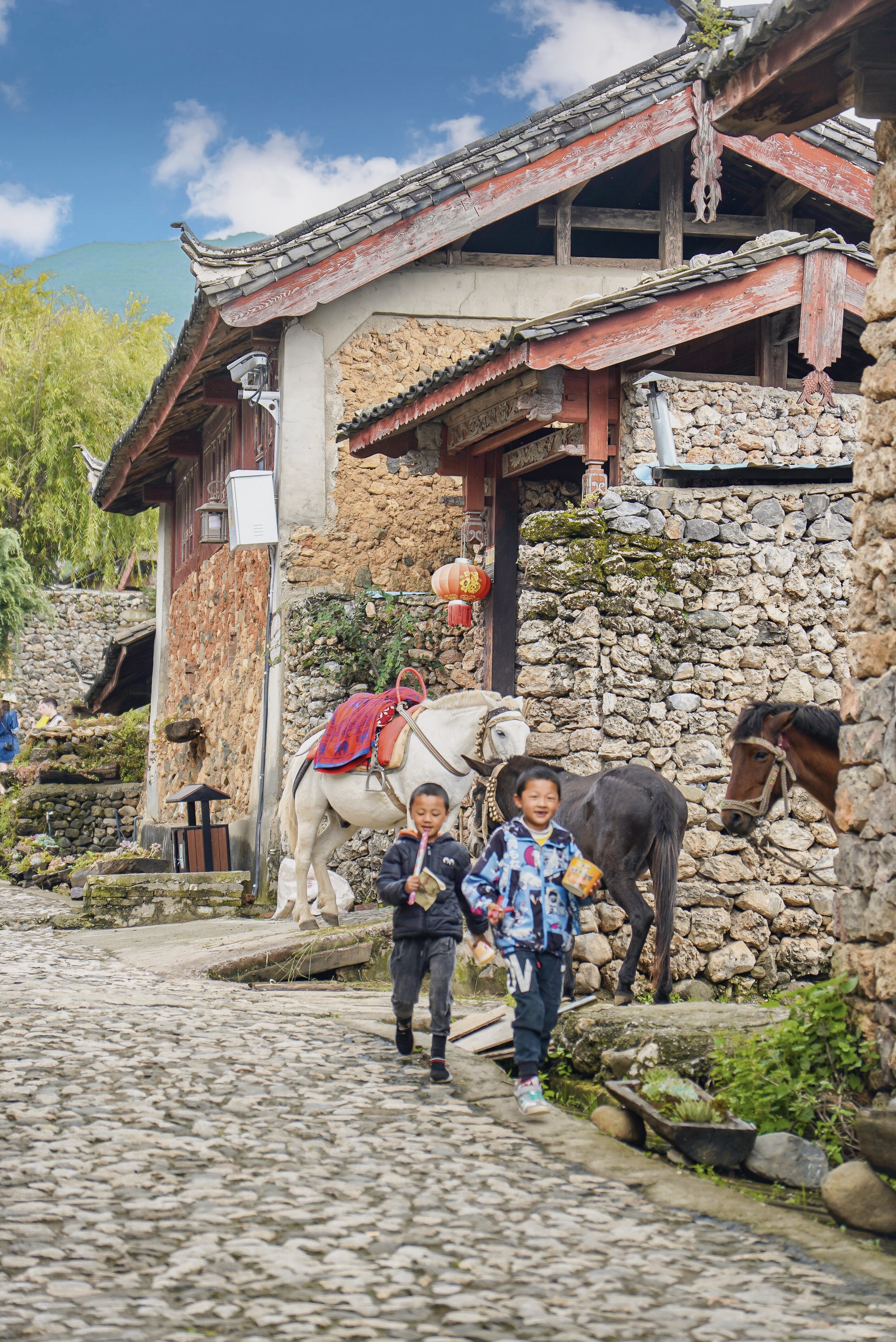 沿着石子路在村里闲逛,会偶遇一两匹马,也会遇见在树下聊天或编织的阿孃,小卖部门口的大爷们抽着烟、说着一口方言话唠嗑着家常,也会跑过几个拿着竹叶打闹的小孩,欢乐地蹦蹦跳跳。