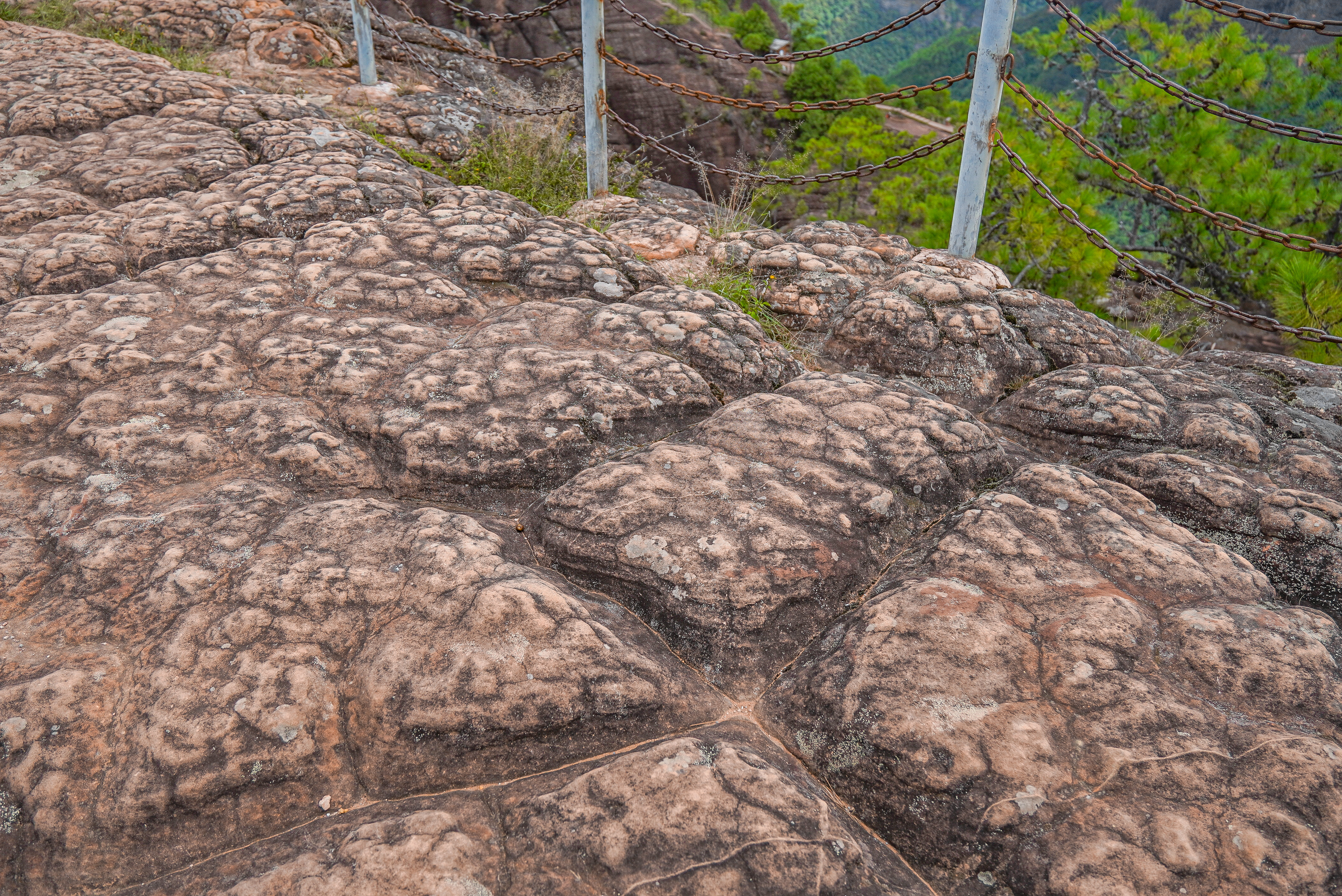 走着走着就已经来到了景区的最里面——千龟山,不仅仅山顶,连沿途的石柱或路面也是,经过风蚀的交错层理非常有特色,而千龟山的山顶更是一片红色岩石风化形成的美丽龟裂状。