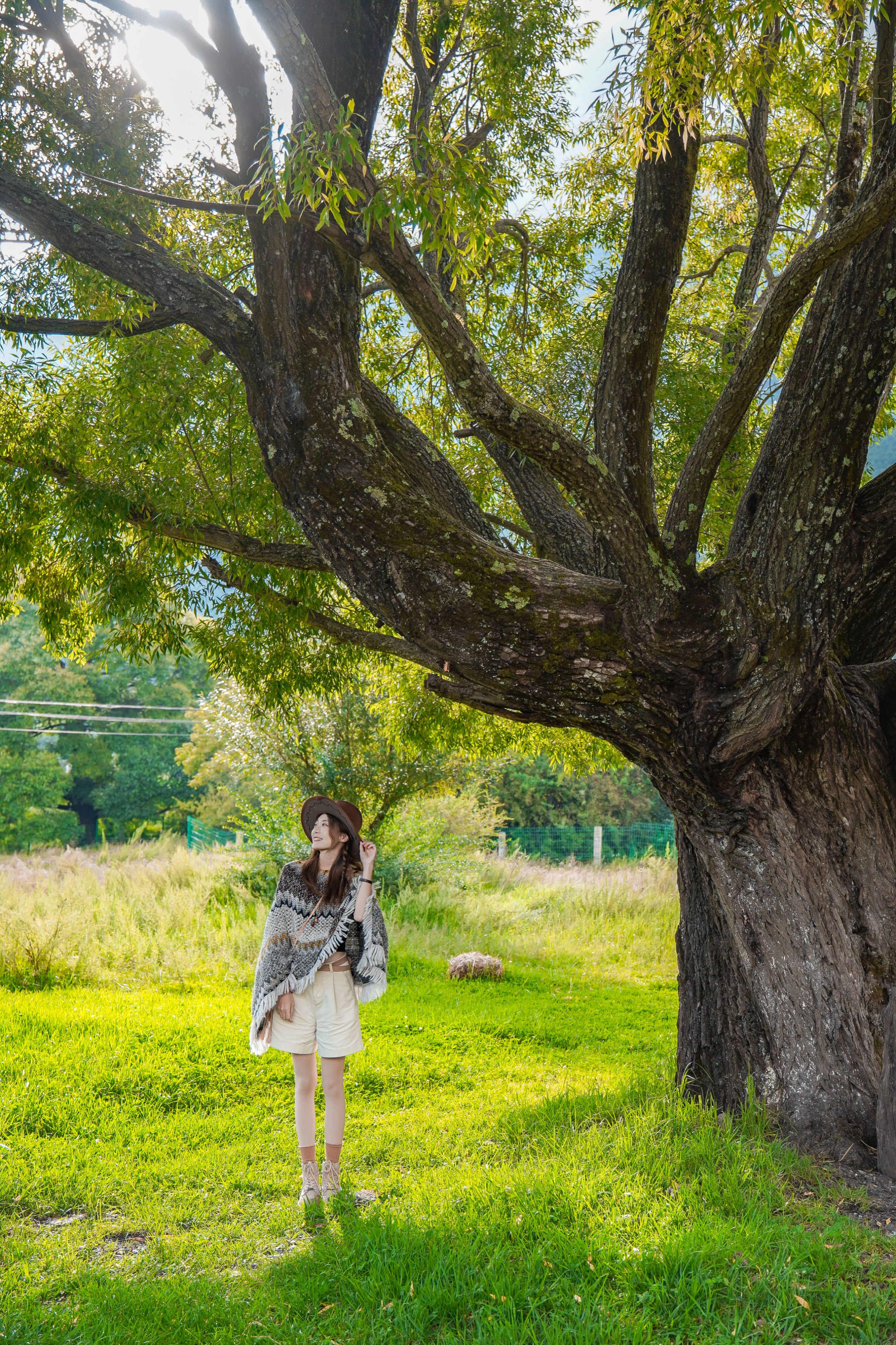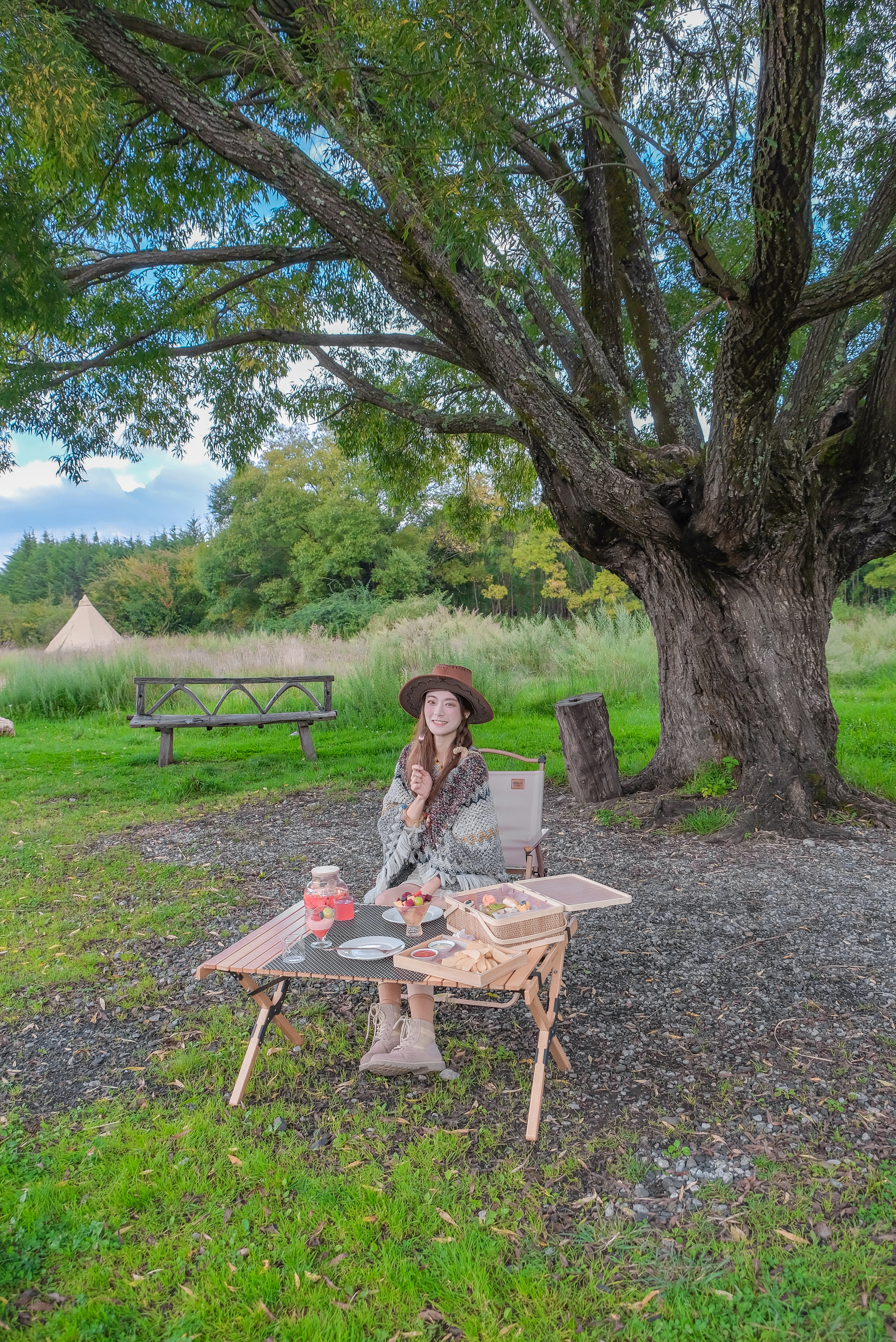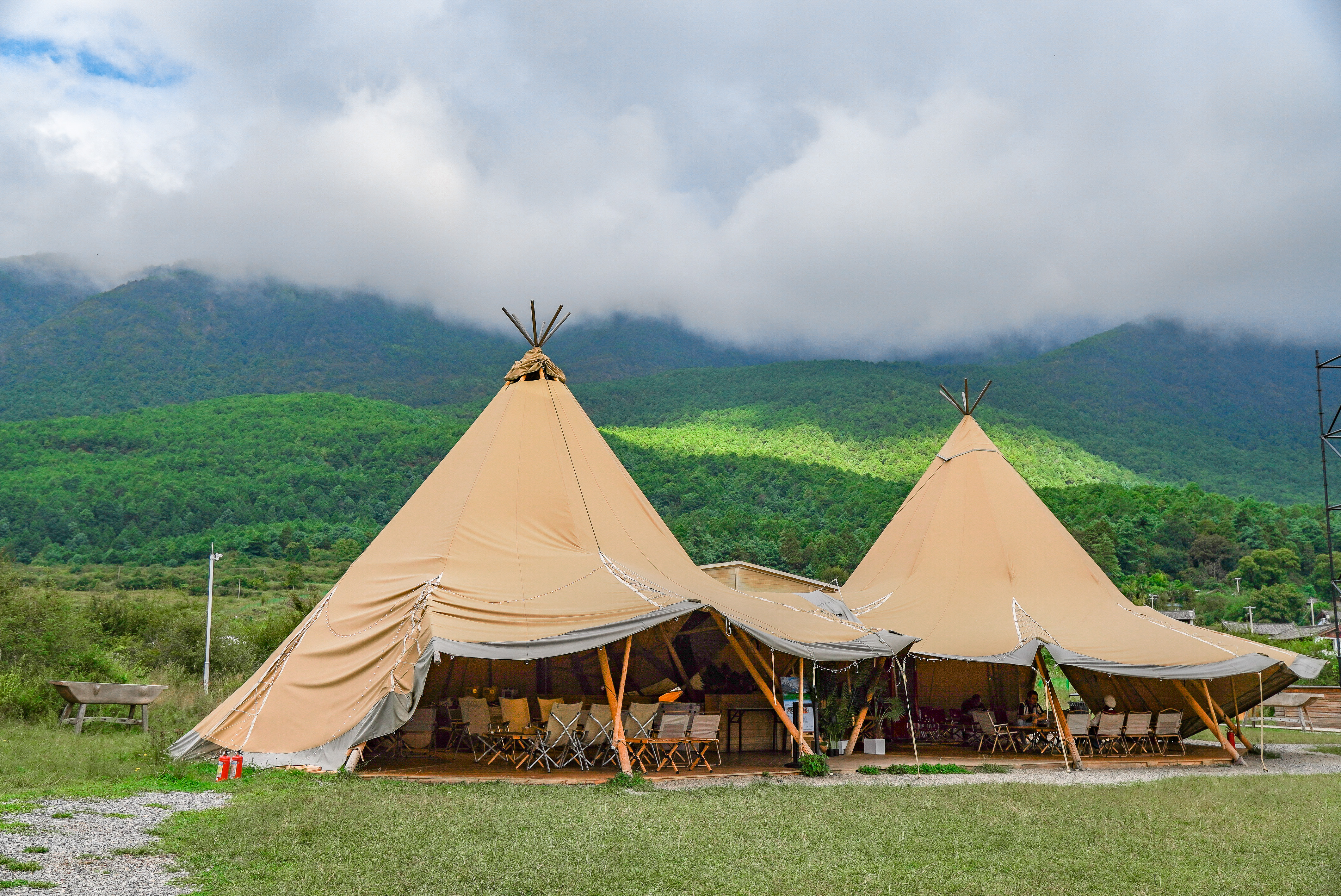 度假村后面有一大片雪山下的草原,蓝天白云的斑驳树影闪烁着,在一棵孤独的大树下,摆好了蛋卷桌与露营椅,享受一场午后的雪山下露营。听说这棵500多年的大树叫“阿美泽”,在纳西语里是“母亲孕育的地方”,就很适合这个纯净而适合发呆的地方了。