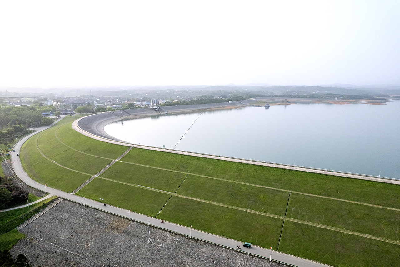 行走在大坝上,一侧是清澈的湖水,另一边是清新的绿。