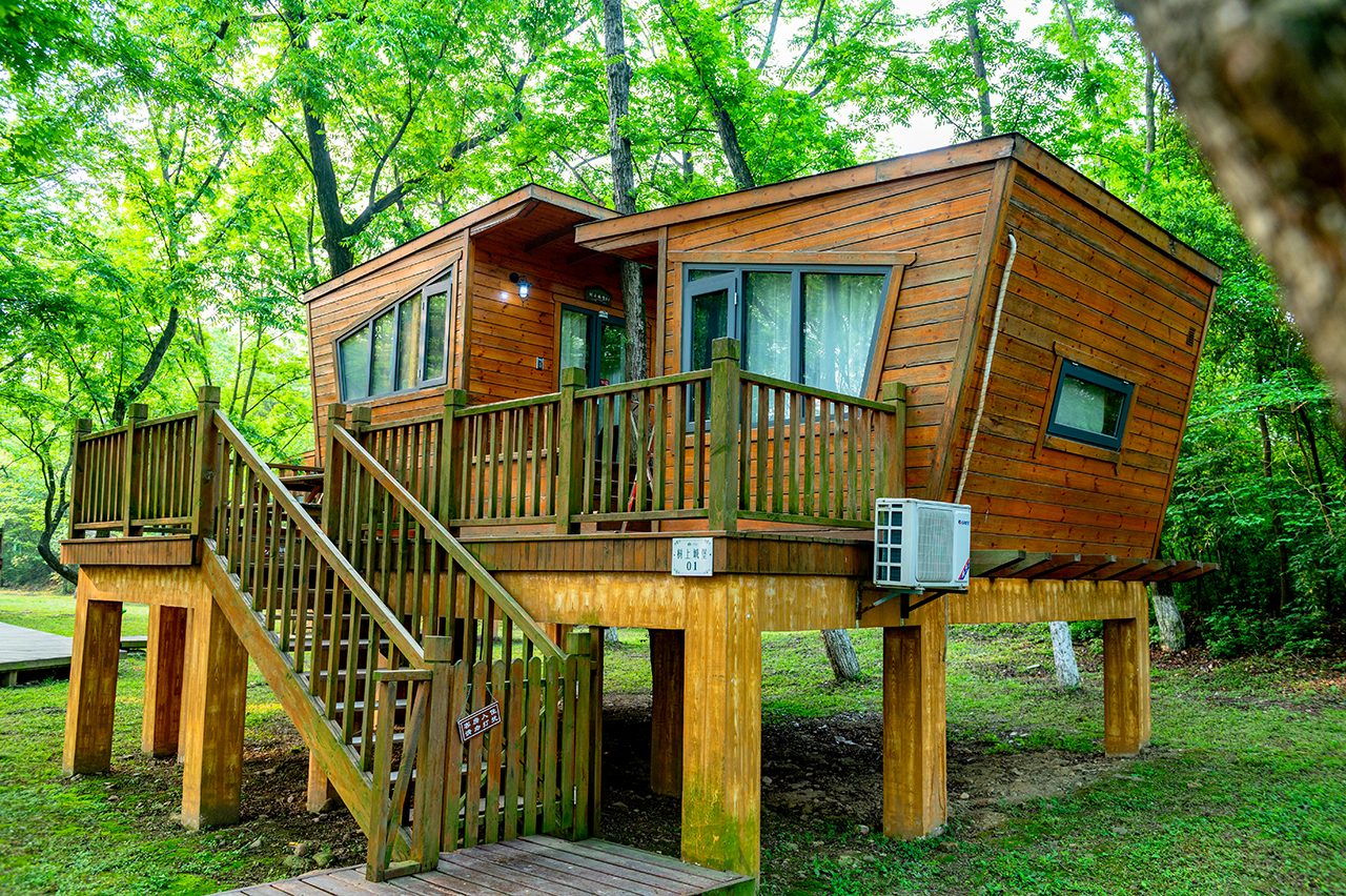 有的木屋还带有滑梯,这种就非常适合亲子,应该没有哪个小朋友能拒绝这样的童话城堡吧?