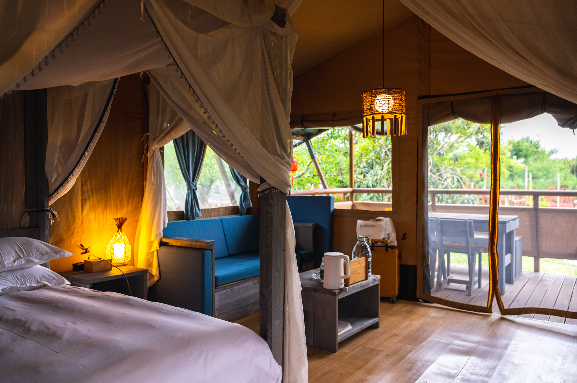 营地的帐篷类型非常多,设施齐全,有专门的户外野餐桌、靠椅、桌布、毛毯、休闲躺椅、烧烤架等,一应俱全,而且还非常适合拍照,随手一拍就是一张慵懒的唯美大片。