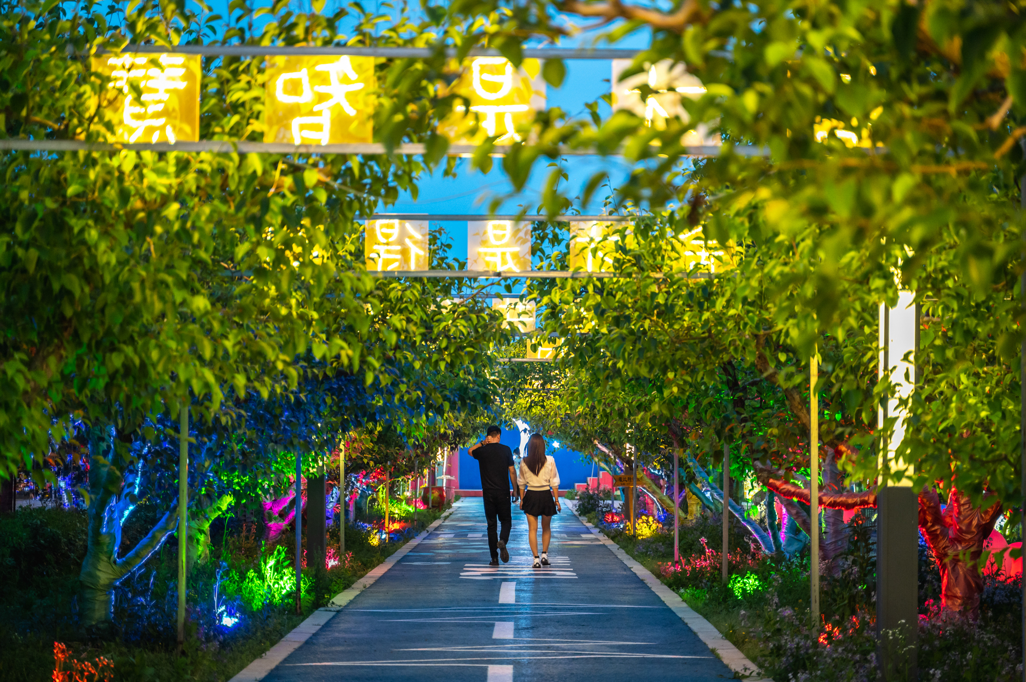 到了傍晚,乐园中亮起了灯火,牵着爱人的手漫步“爱情隧道”,吹着微风,浪漫与惬意感让人十分放松。