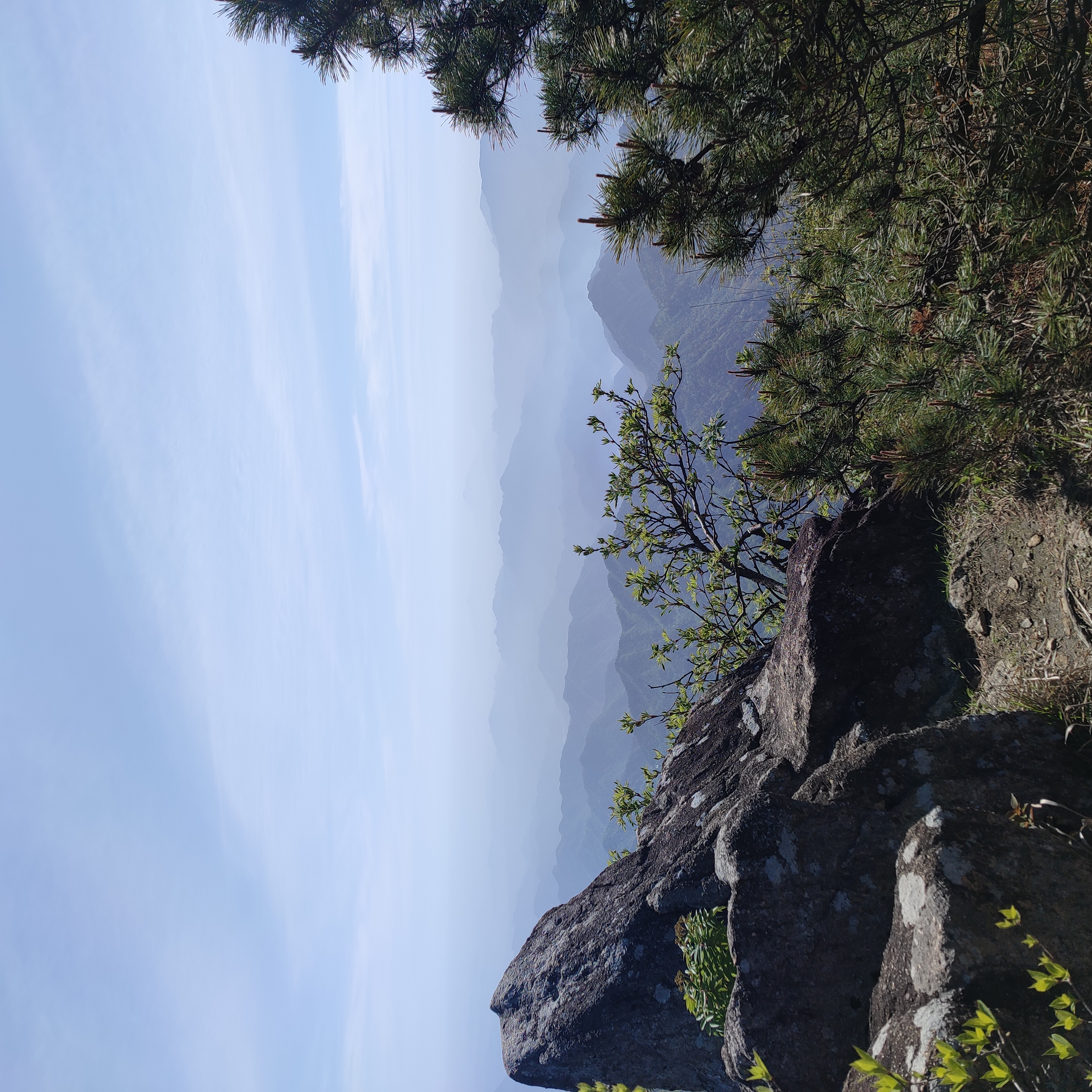 手机照相无法记录峰顶的开阔。登上顶峰,四周环绕着天目山脉大大小小的分支,远处还可以微微眺望到黄山。