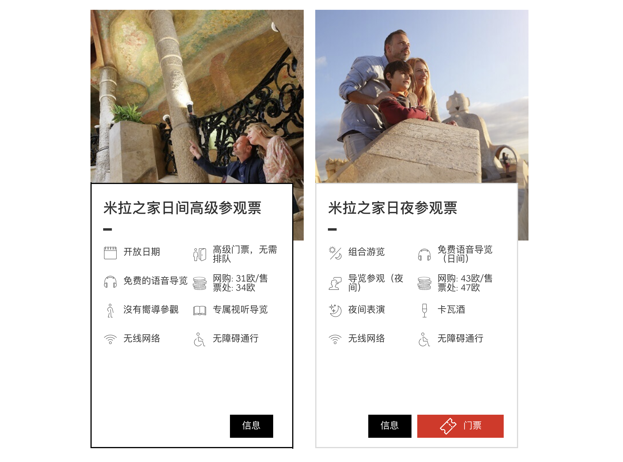 服务包含:日夜组合游览、免费语音导览(日间)、导览参观(夜间)、网购43欧/售票处47欧、夜间表演、卡瓦酒、Wifi网络、无障碍通行
