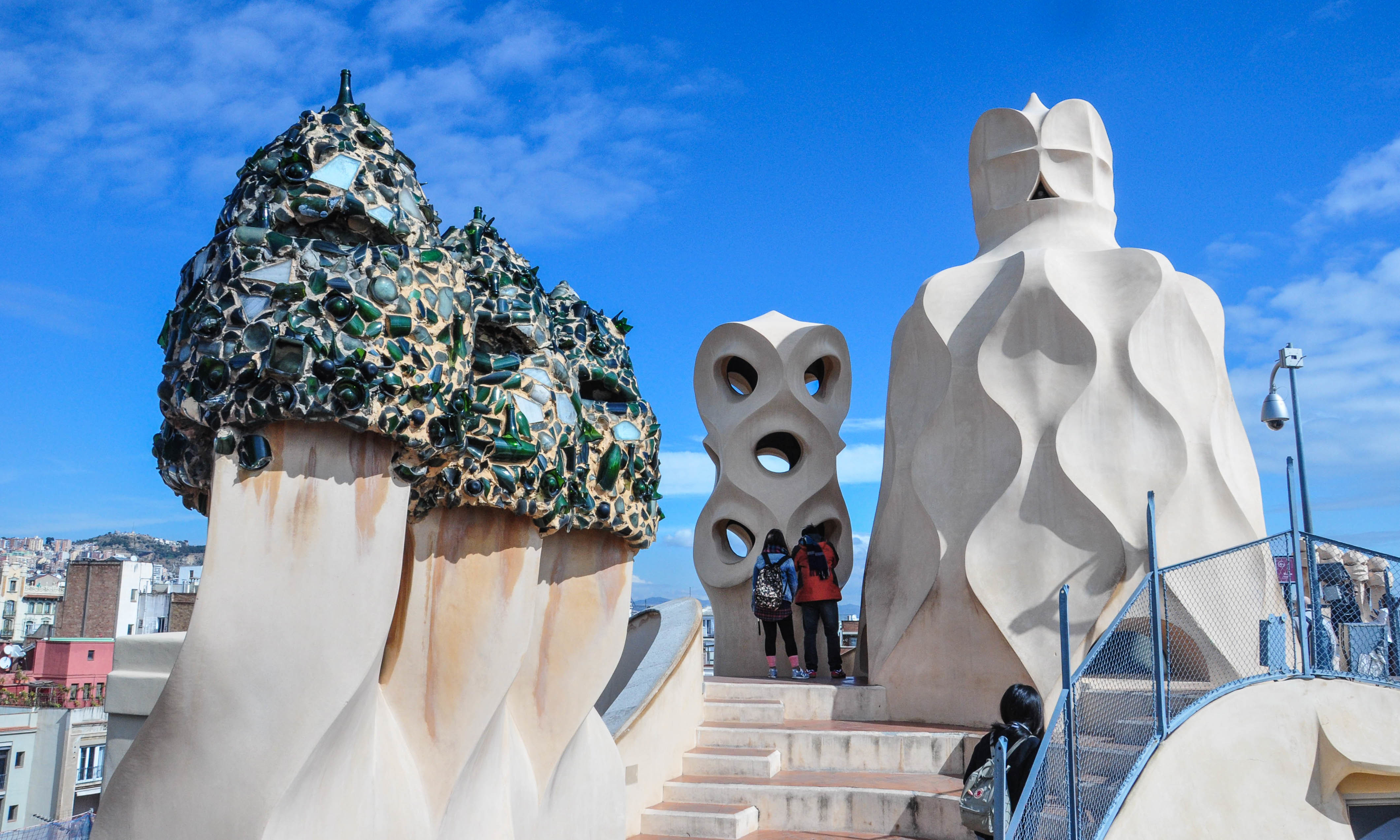 高迪亲手设计的这些形态各异的大柱子都是有实际作用的,有烟囱、通风塔和楼梯出口,这些设计已经超越了本身的实用性价值,高迪将其转化为具有特殊外形的雕塑。