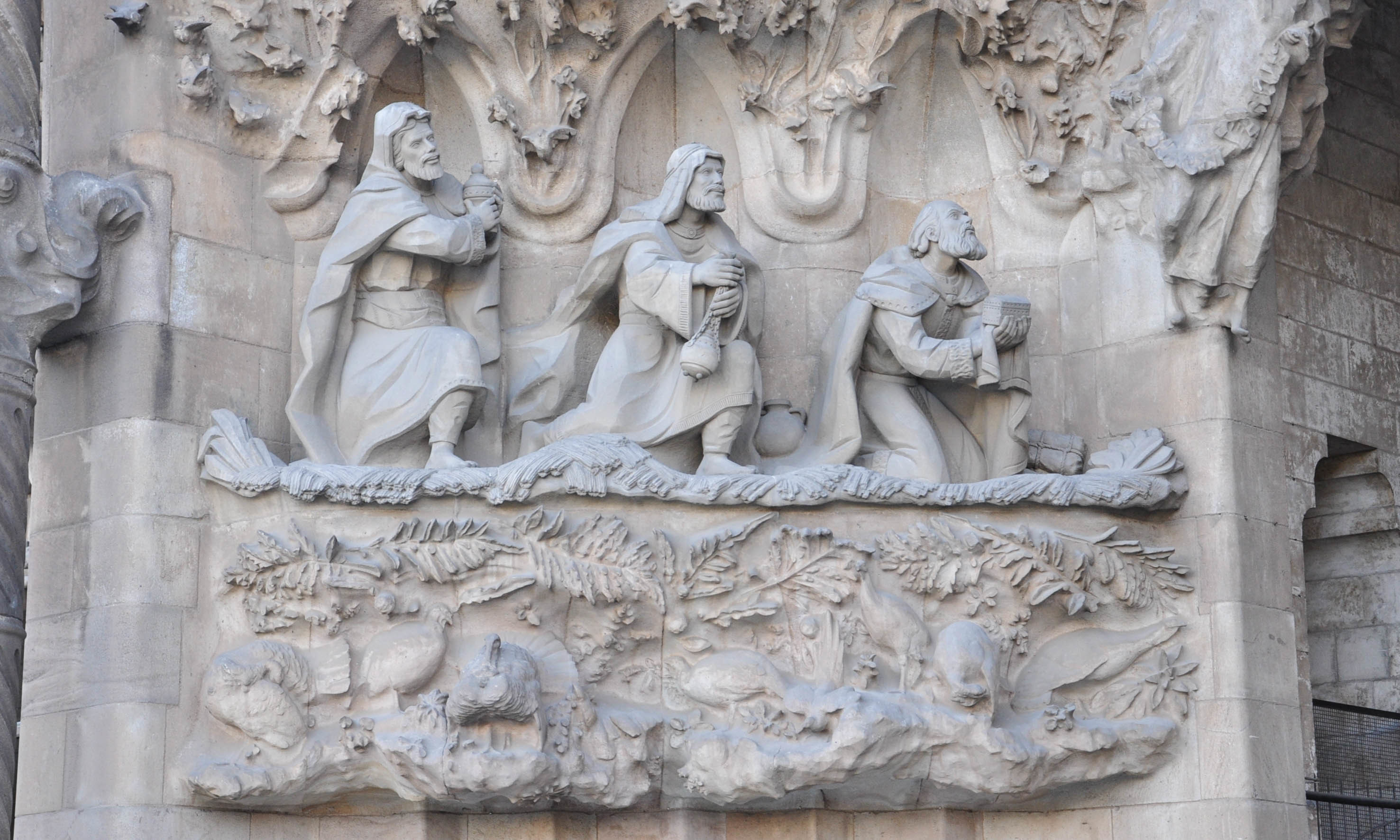 神圣家族大教堂的外部有三个立面:诞生立面、受难立面和荣耀立面。现在诞生和受难两个立面已经完工,上图是诞生立面的博爱门廊,博爱门廊描述了玛丽亚受孕、耶稣诞生、耶稣孩童和青少年时期。