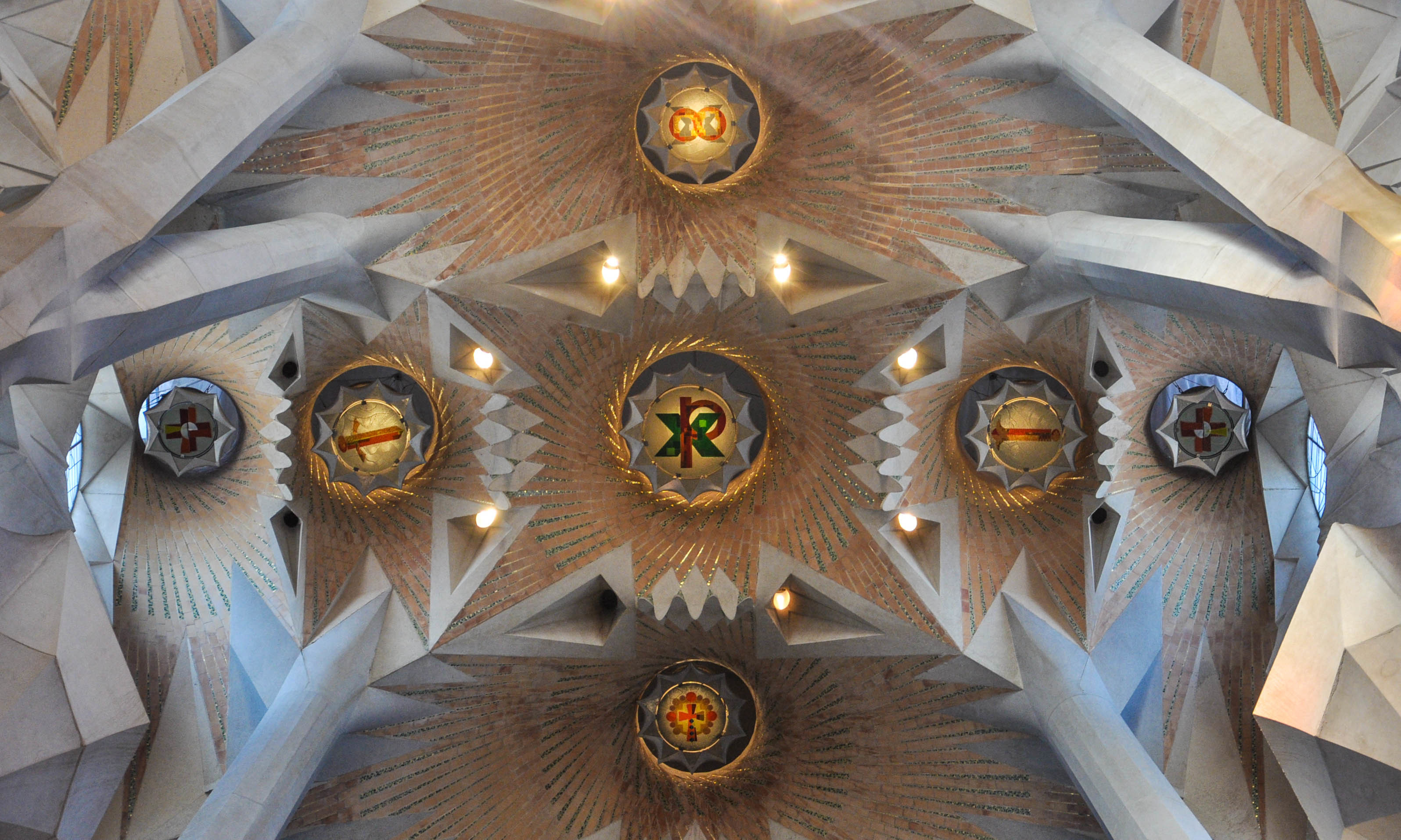 在主殿的拱顶上方有许多具有天主教图案的柔光镜,高迪在这里采用柔光镜将光线过滤,既能拥有普通照明功能,也使光线更加柔和自然。