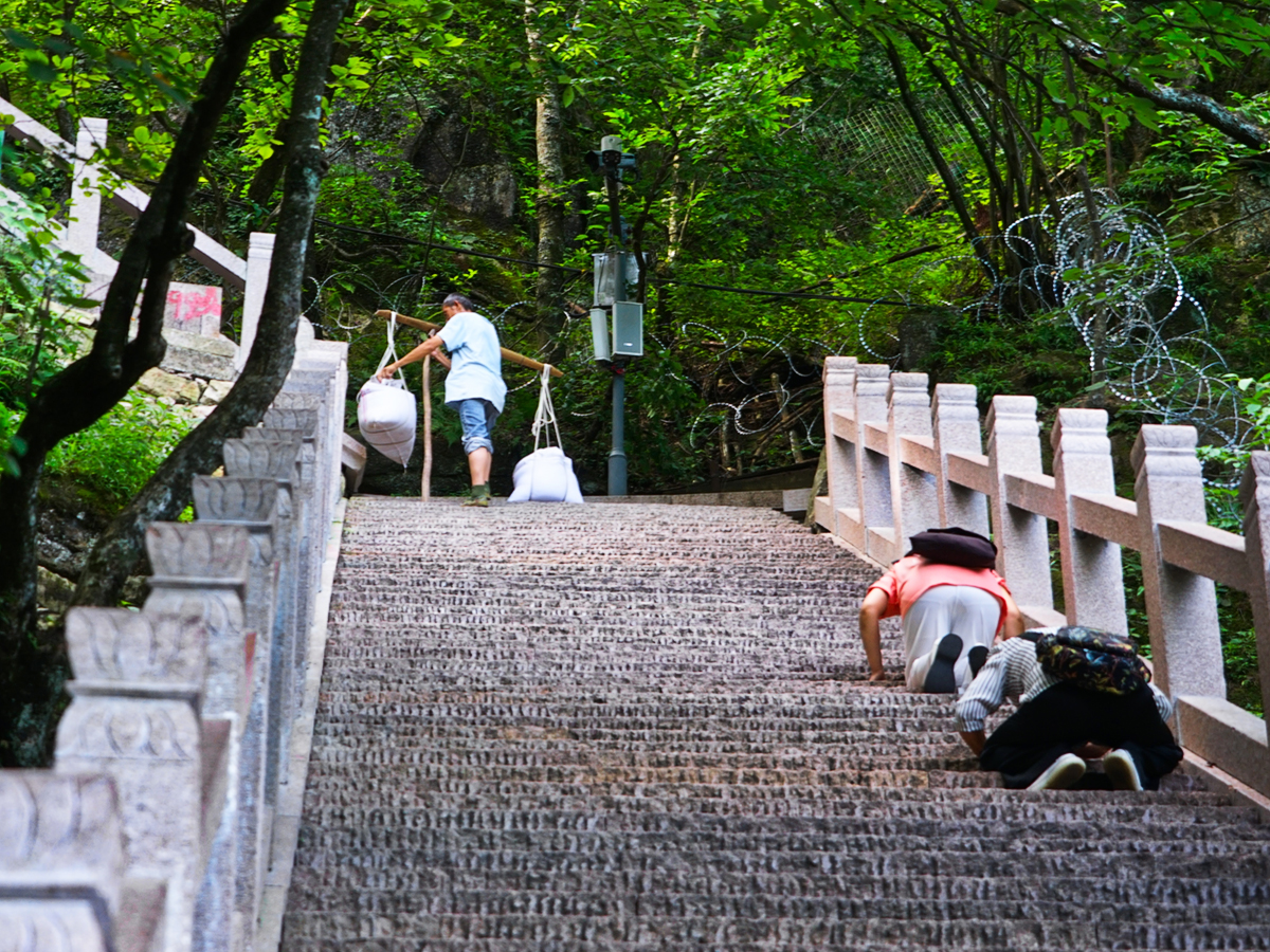 九华山上,无 论山 路崎岖,还是石阶陡峭,看到身体晒得黝黑的挑山夫,挑着百多斤重担,一步步艰难地向上攀登,汗水不停地滴落,不禁让人肃然起敬。挑夫们挑的是沉甸甸的生活,挑的是九华山的脊梁!