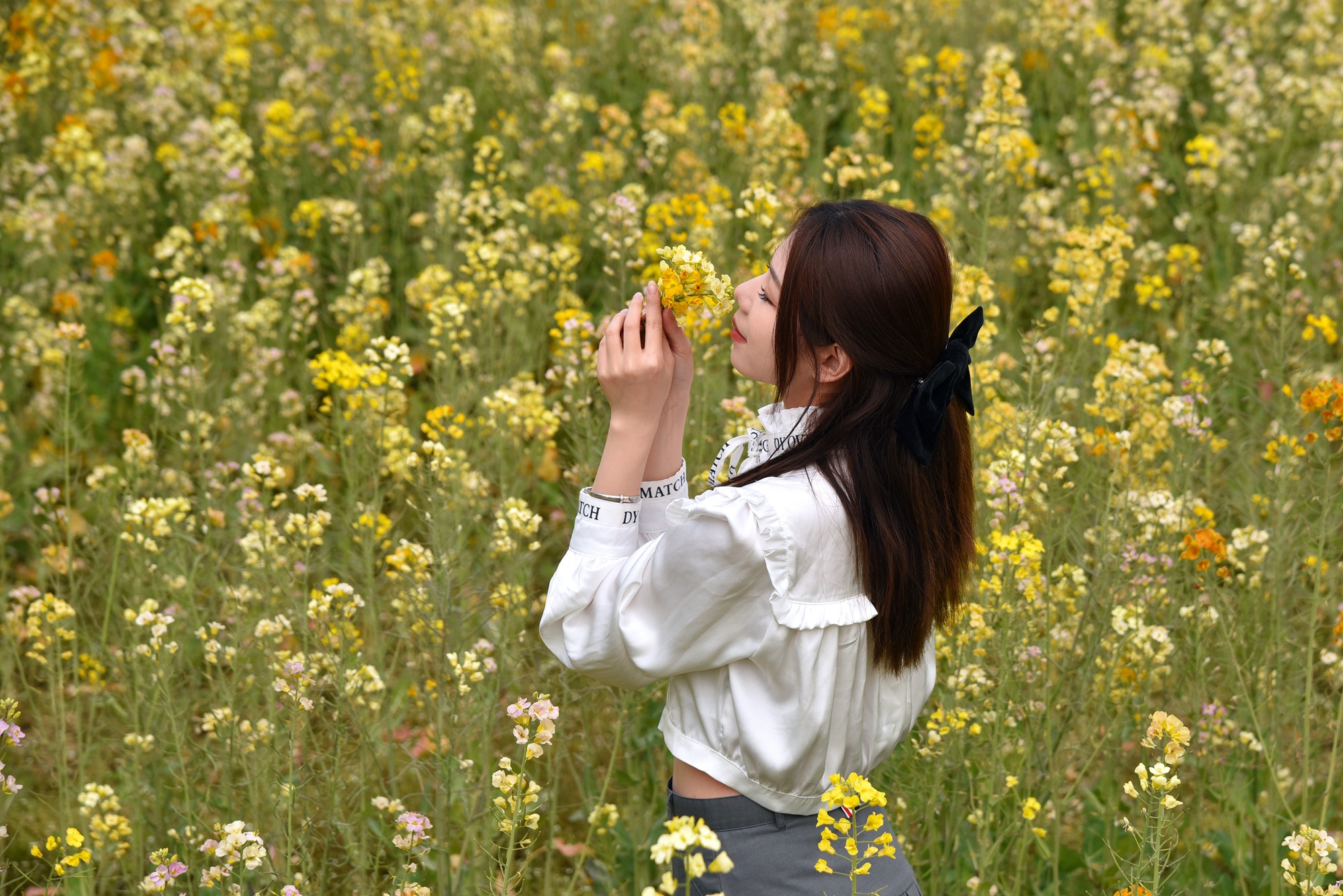 在脉地农场,我们走进了玫瑰园,没看到玫瑰,却看到了一大片萝卜正在开花。本来是萝卜生产田,平淡无奇的小花,但开成连片,在我们看来就是花海景观,于是纷纷拿起相机、无人机,照片、视频各种拍。本来很少拍人像,但气氛已经烘托到这了,也随手拍了好几张。