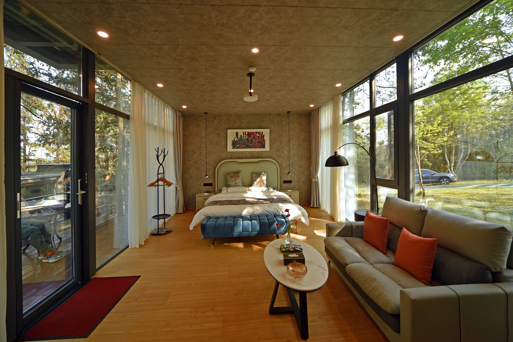 走进树林里的玻璃房,两边透明的落地窗直通屋顶,不仅采光充足,也把卧室与室外环境融为一体,就像睡在树林里,伴着鸟语花香,与自然零距离。