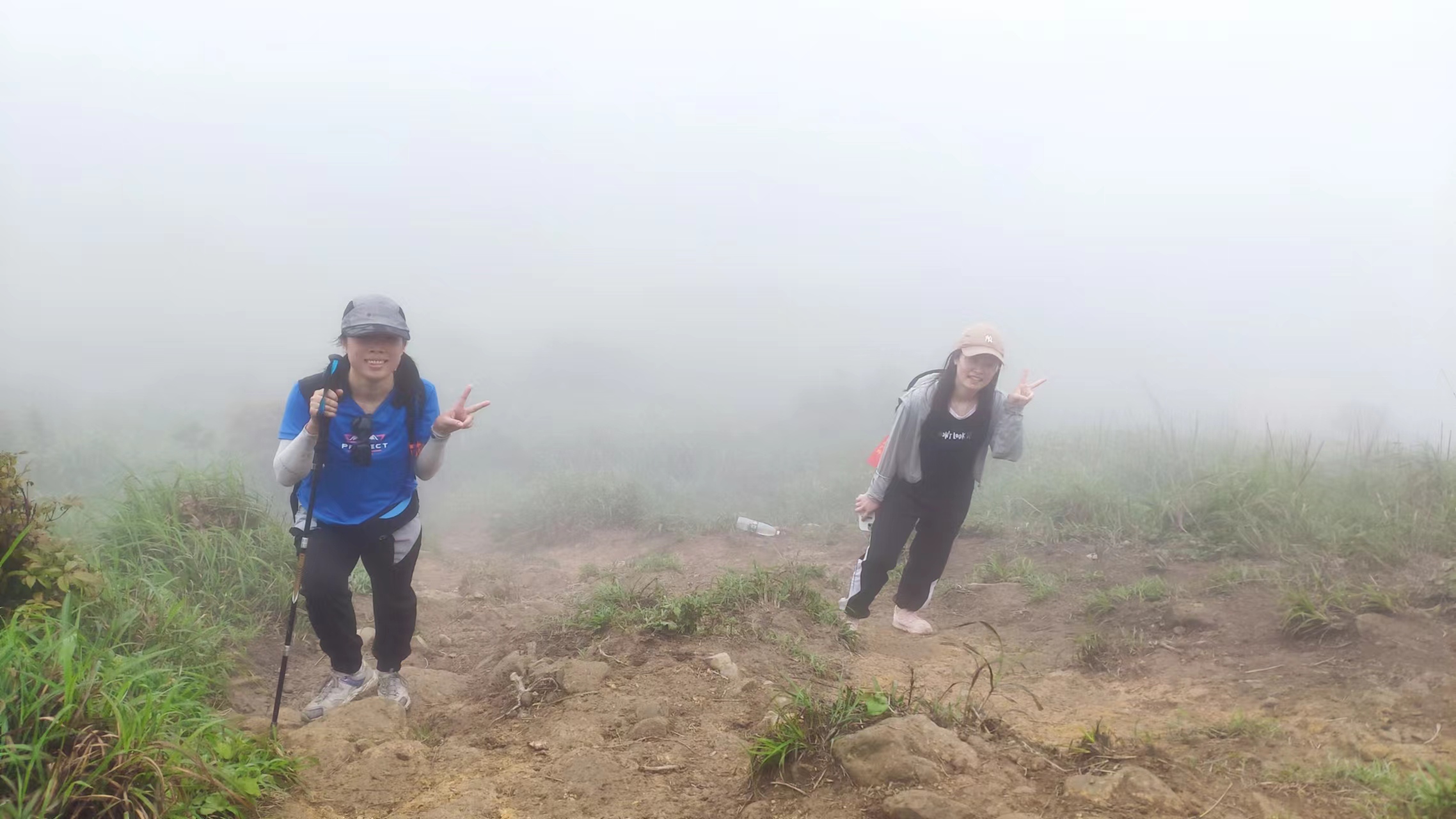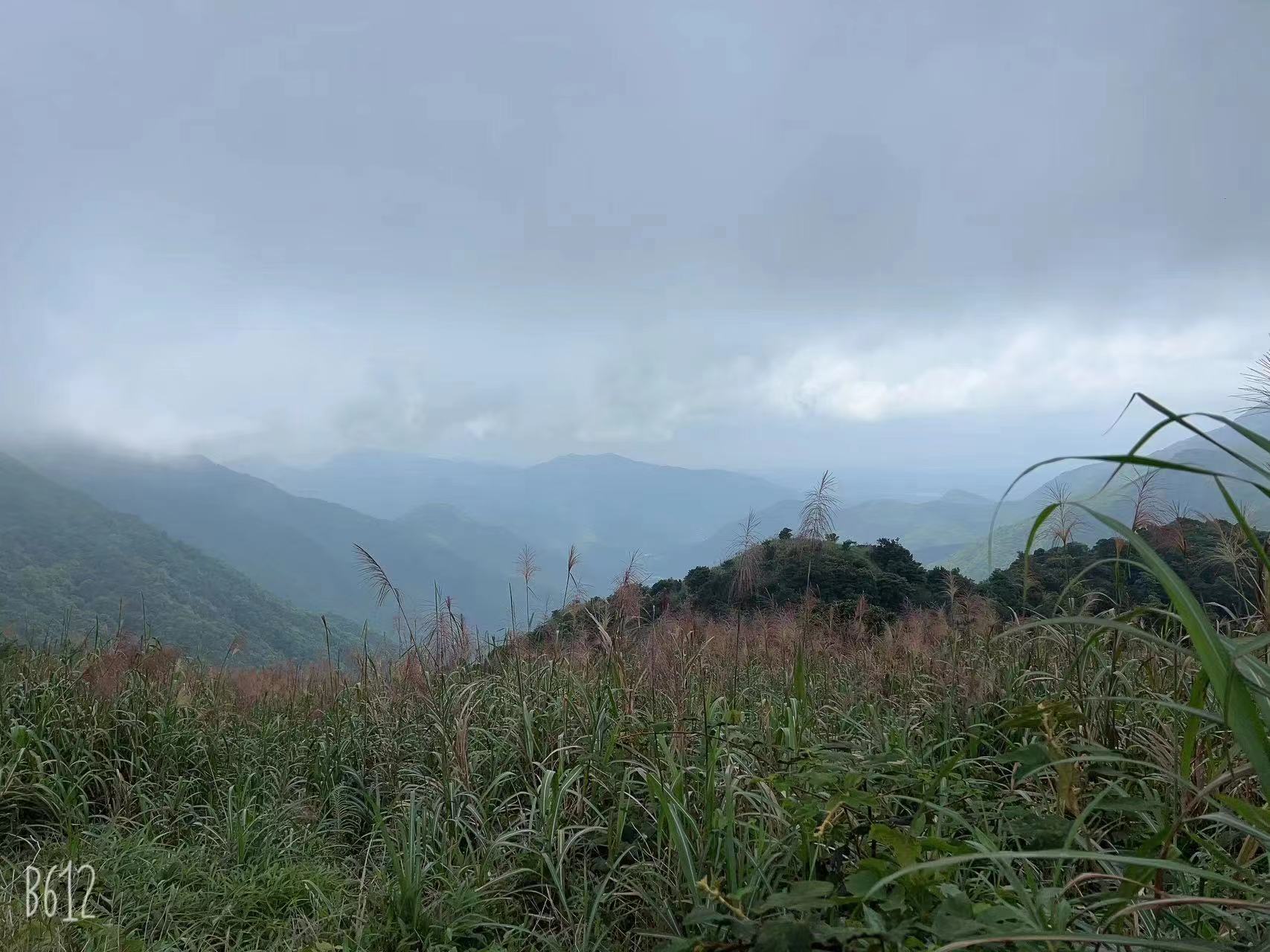 徒步线路与机耕路的交叉口处,有一处开阔地带,好多驴友在此休憩、补给、拍照。我原本是计划在此处等候纵横户外俱乐部的小伙伴们,可是呢,这里已经海拔800多米了,一停下来就感觉身体发冷,于是我便走一程停下来等一程。直至约13:40时,看到一位小伙伴背包上系着纵横户外俱乐部的丝带,交流后得知她是木子,也是和队伍走散了,后来与暴走村俱乐部一位走散的小伙伴走在了一起。于是,接下来我们三人便相伴而行。朦胧的天气,朦胧的草甸,朦胧的行程,朦胧的记忆。