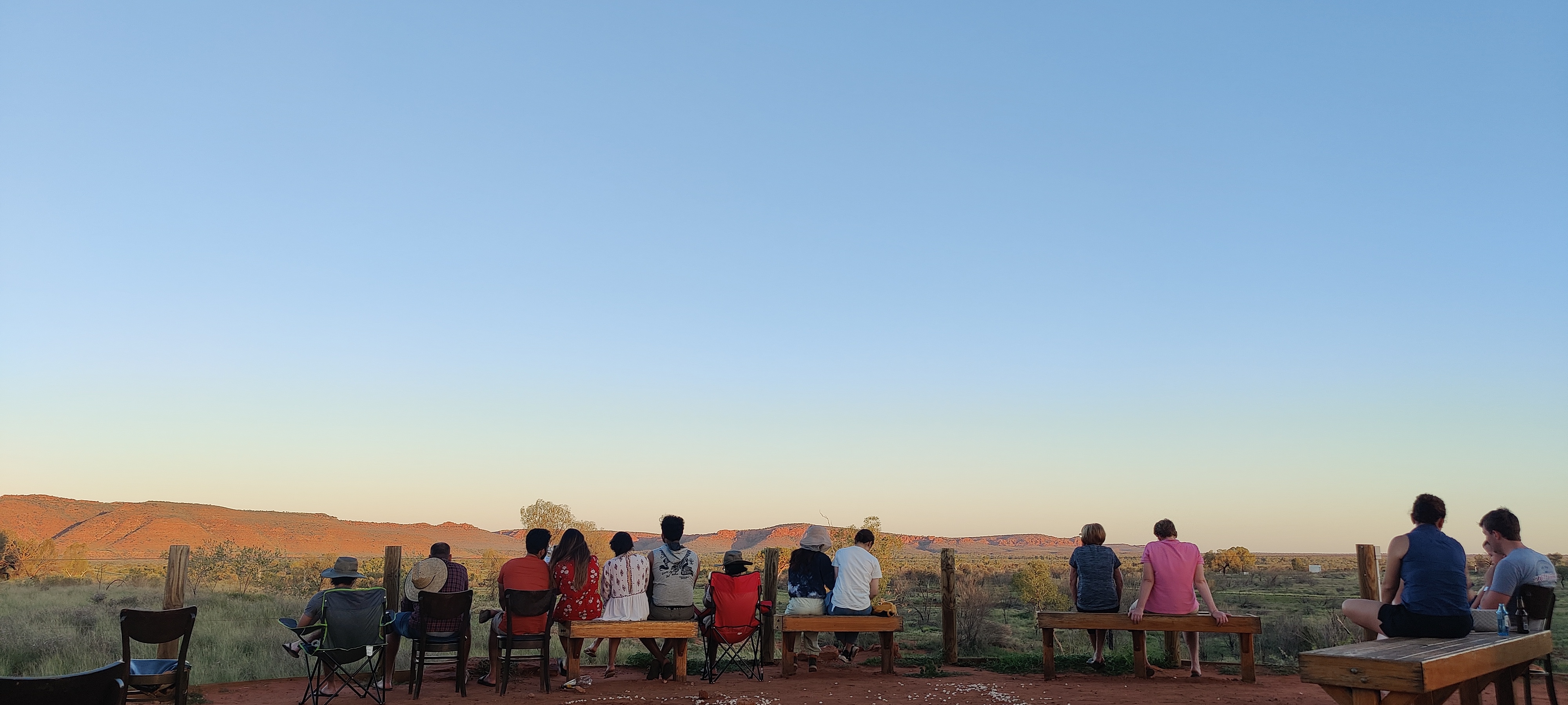 大巴车把我们放到了一个小山丘的空地上面,在这里会有小哥哥吹着土著特有的乐器欢迎各位宾客。同时,他们还会提供香槟,啤酒,饮料供宾客饮用。在这里,宾客们观赏乌鲁鲁日落美景🌇,然后相互交谈,基本是一个前奏仪式。