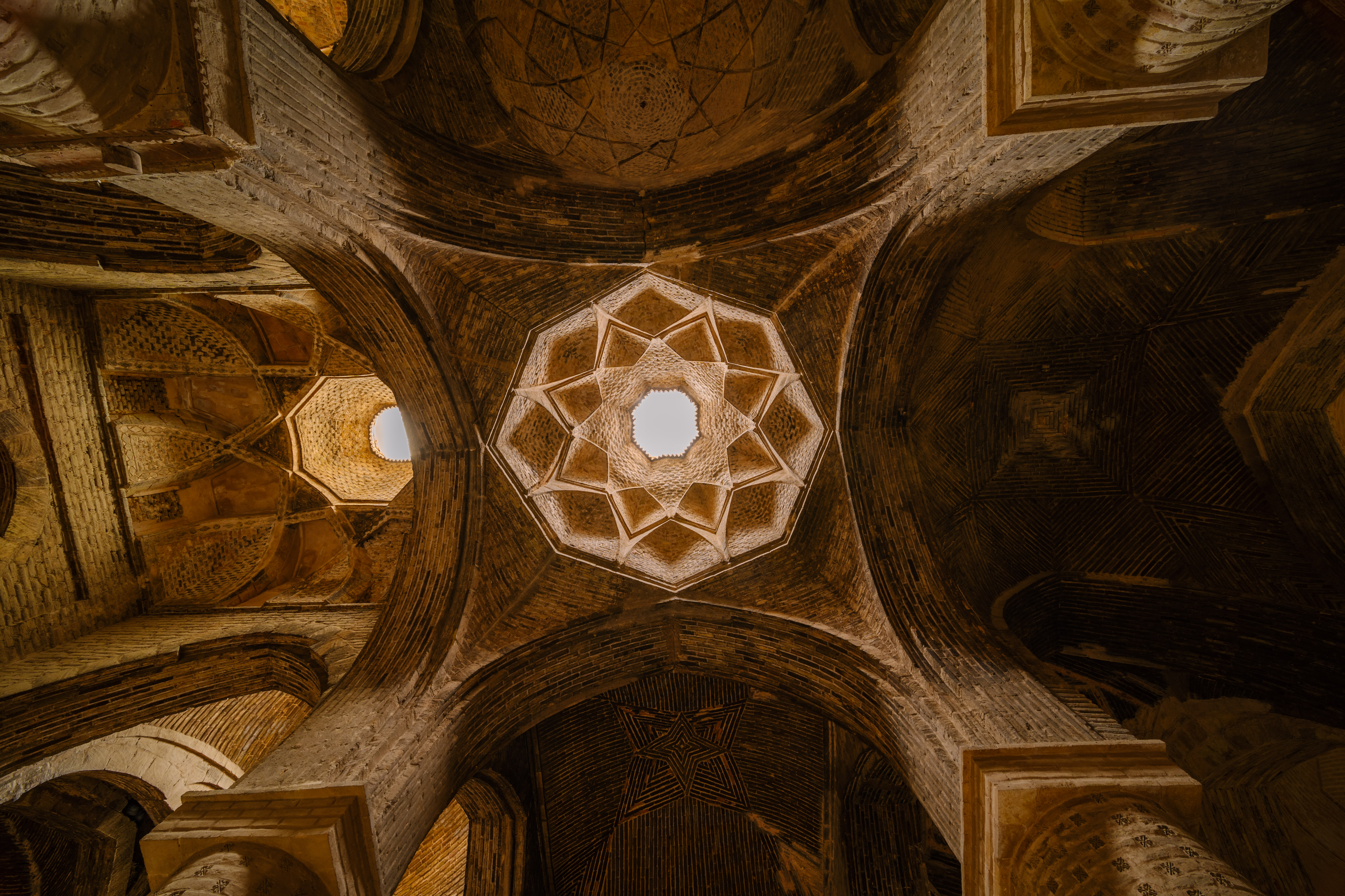 聚礼清真寺,建于11世纪,是伊朗现存最古老的清真寺,前身是拜火教的寺庙,阿拉伯人占领以后,改建为清真寺。每栋建筑几乎都是当时巅峰之作的典范,涵盖了从塞尔柱时期优雅的几何风格,到蒙古时期甚至是偏向巴洛克风格的萨法维时期建筑。占地超过2万平方米,是伊朗最大的清真寺。 入口处很低调,一进门就是古老的建筑,跟前几天看过的BINGBING风格或是繁复的马赛克风格完全不同,朴素的砖混结构更能体现几何光影之美。 主庭院中央是模仿麦加Kaaba设计的净身泉,想要去麦加朝圣的信徒要先在这里熟悉仪式程序。正在维修,寺庙倒影在碧蓝的池水中的美景无缘得见了。 寺中有个小房间(Room of Sultan Uljetu),内里有个用陶土造成的壁龛(Mihrab),永远是朝向麦加的,上面雕满了细密的花卉图案与《可兰经》铭文,说它是最美壁龛也不为过。再进到隔壁另一间冬天祈祷室(Beit Al-Sheta),地上铺满波斯花纹红地毡,看不出有什么特别……但当关上灯,你会发现从天花透进的一点点天然光,竟慢慢把白色的墙身照亮,使一室不至完全昏暗,建筑之奥妙不言而喻。