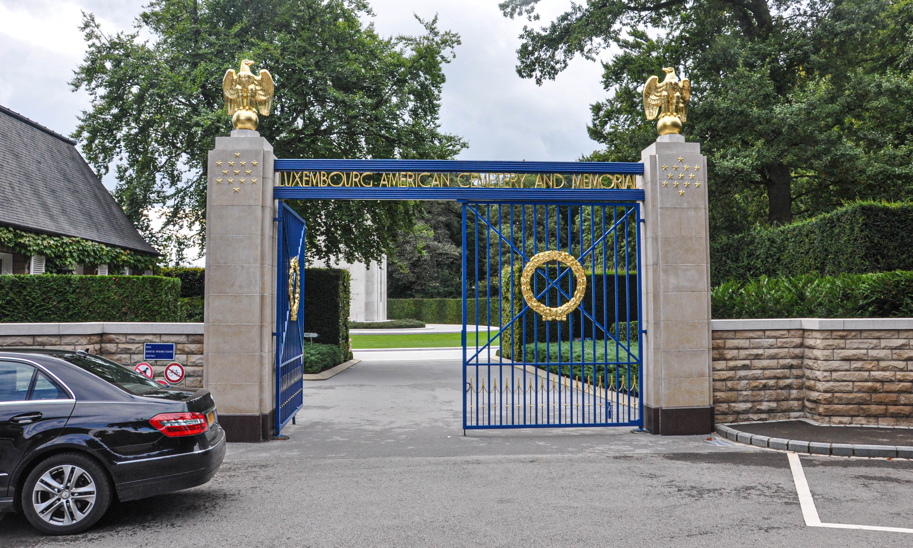 抵达卢森堡美军公墓,大门一扇关闭一扇敞开,顿时感到凄凉的气氛,公墓入口的两扇大门均为铁质材料,每扇重一吨左右,门上的镀金花圈象征着勇士的奖励,门柱上的13颗星星代表美国最初的13个州。
