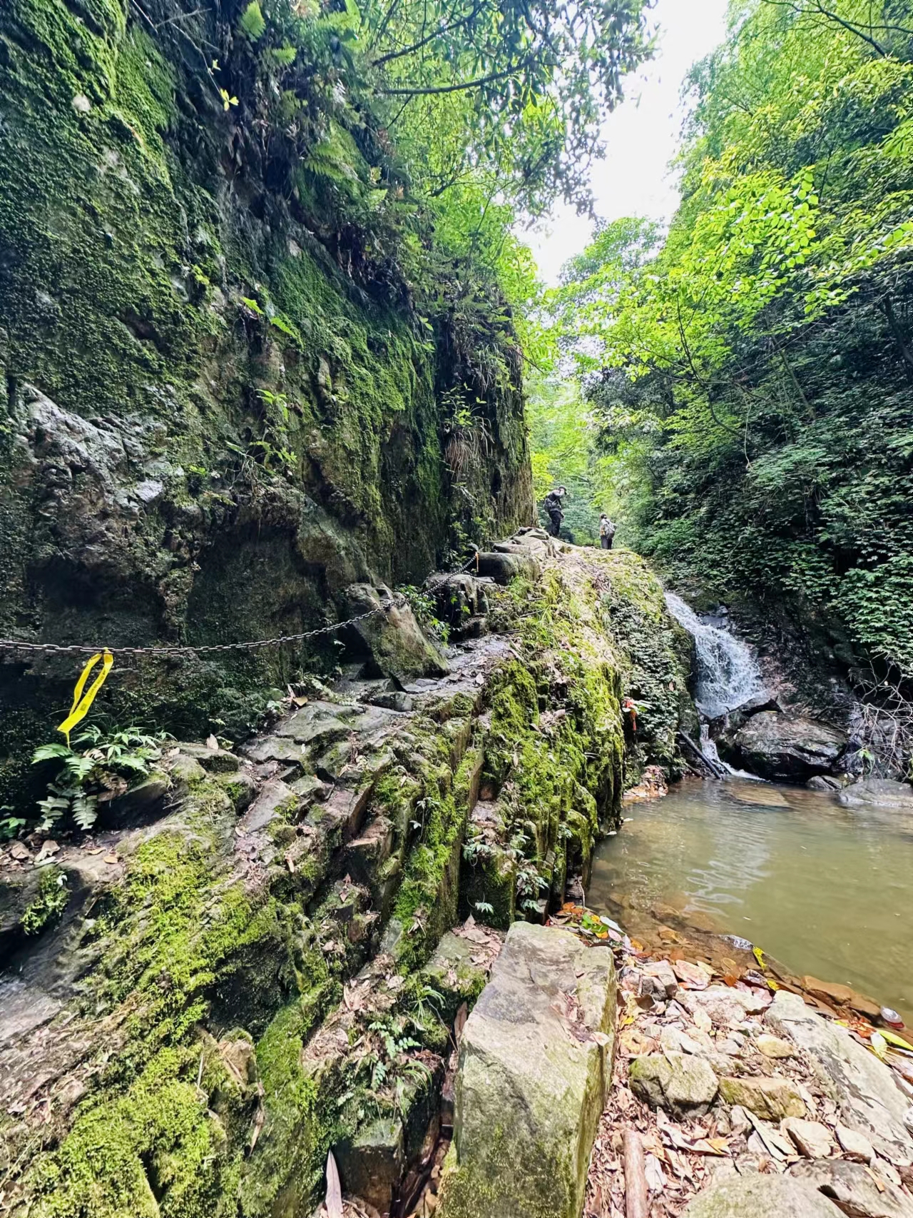 渐渐地,路迹不那么明显了。而这样的地方,往往有意想不到的美景出现。流水、岩石、青苔、绿竹、小伙伴们,经过简单地组合,成为了一幅经典的画卷。我们跳跃一块块浮出水面的石块,在紧张与兴奋的交织中,行走在神仙峡谷的道路上。途中有几处地方,需要贴紧岩壁,抓紧绳索,踩牢石块,颤颤巍巍地走向前方。这种颤颤巍巍的感觉,让我想起了初玩户外时体验飞拉达,几年过去了,我还是恐高呀,却又菜又爱玩。这里,非常感谢村民们、前辈们打下的绳索与铆钉,有效地帮助我们平衡身体,安全跨过一道道小小的“天险”。