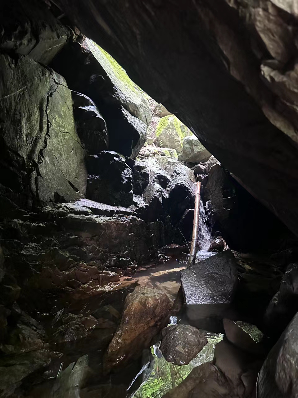 约11:30时,我们来到了一块大石头下,盲猜有三四米高。领队养家指挥着小伙伴们,抓紧绳索,攀爬而上。真没想到,这段路还有攀岩的体验呢。随后,钻过一个小石洞,结束了涉水攀岩的奇异之旅,回到了正常的户外世界——穿梭小树林。这段路途中,遇见了几支户外队伍,皆是慕名而来,在神仙峡谷开启周末的丰裕时光。其中一只队伍,有三位小朋友,非常勇敢、坚强,在小小的年纪里就启动了大大的户外生涯。