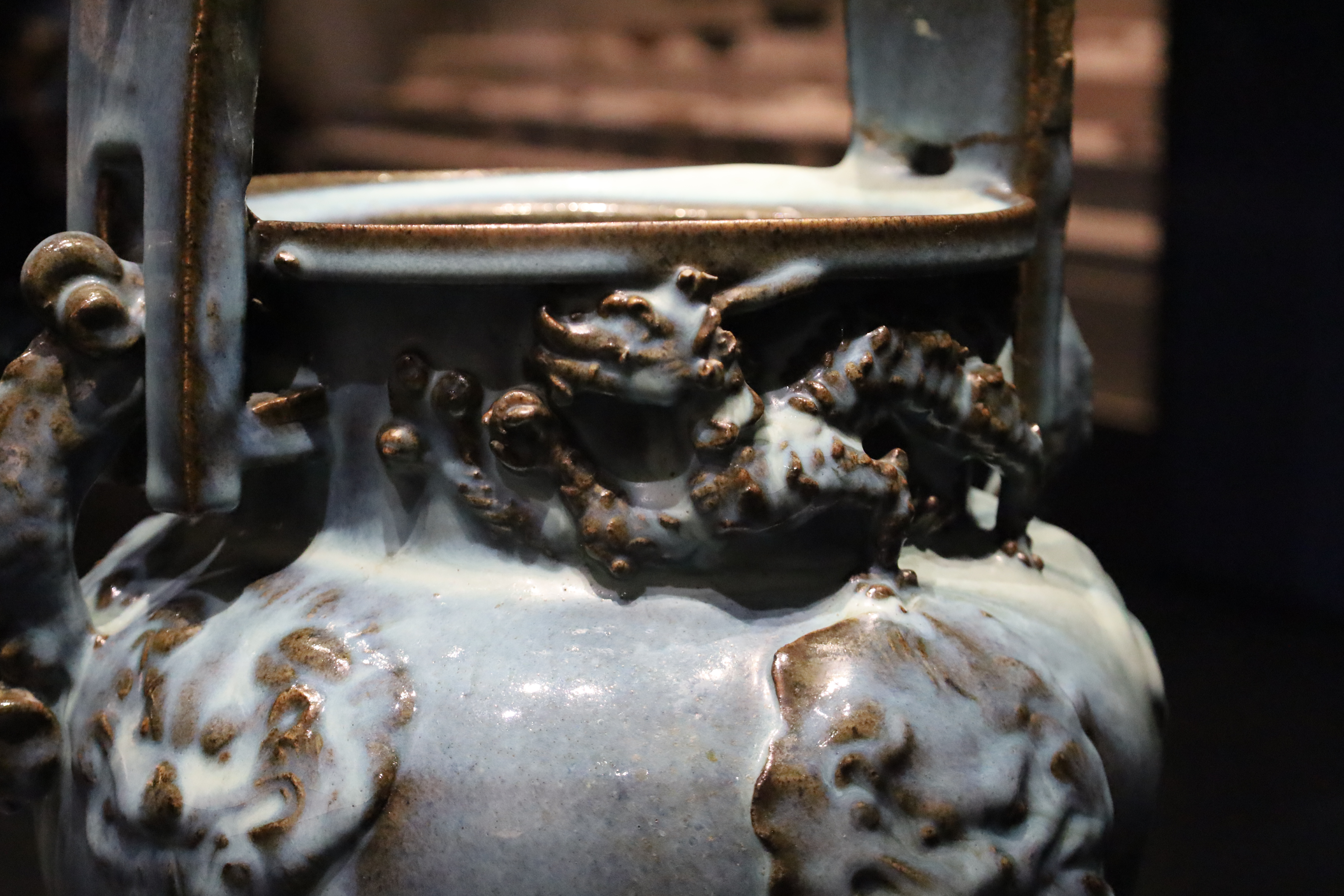 口径25.5厘米、高42.7厘米,双立耳、圆鼓腹、三兽足,足尖刻出三条爪痕,口沿两侧各有一长方形直耳,口沿至肩部两侧装饰有兽形耳。颈部雕贴3个麒麟,正面一双麒麟间有一方形题,刻“巳酉年九月十五小宋自造香炉一个”楷书铭文,背面一只麒麟行走于颈部。腹部饰四个兽面铺首衔环纹与兽面纹,因浓釉垂流经过,局部轮廓略显模糊,虚实相映。