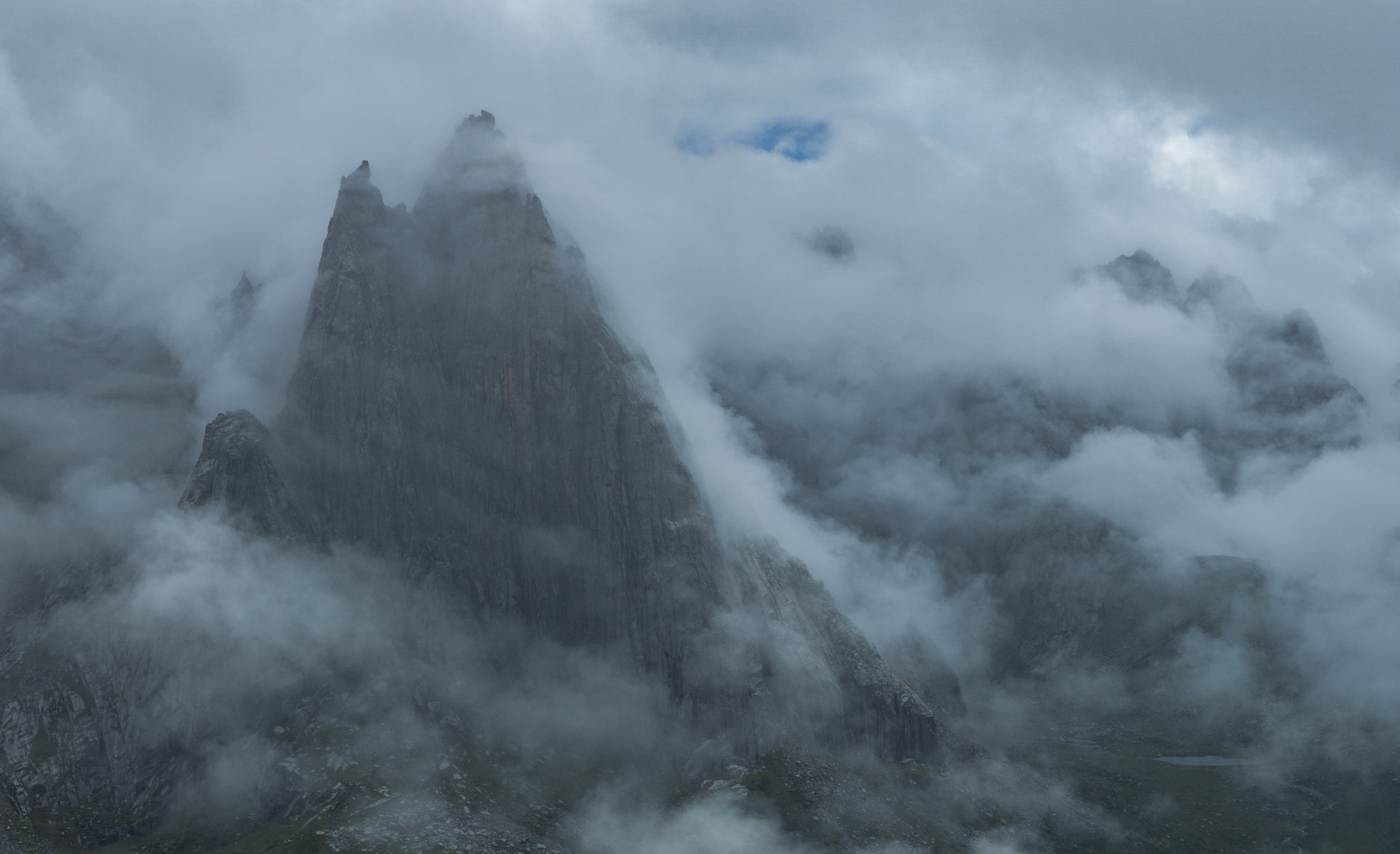 其中几个巨大的"U"型谷和雄伟的冰蚀谷峰在云雾笼罩中跃入眼帘,浓浓密雾从高高的石峰顶部不断升腾,如喷发的火山口、烽火台;扎尕尔措湖面海拔4600米,面积约0.6平方公里,是阿坝县境内四个著名湖泊中海拔最高的湖泊;湖水清幽宁静,游鱼穿梭,湖中有一种小巧奇特的"大肚"胖鱼。湖口东侧是雄浑的石峰,西侧有一座一大二小的尖利石峰直刺天空,象是扎尕尔措的门将和锐利的宝剑。湖后是如刀劈斧削的锋利刀刃般长长的绝壁“城墙”,这里不但具有刚毅雄浑、肃穆悲壮的一面,还包含着女性般的圆润、细腻与阴柔,集雄险、悲壮、秀丽于一身。