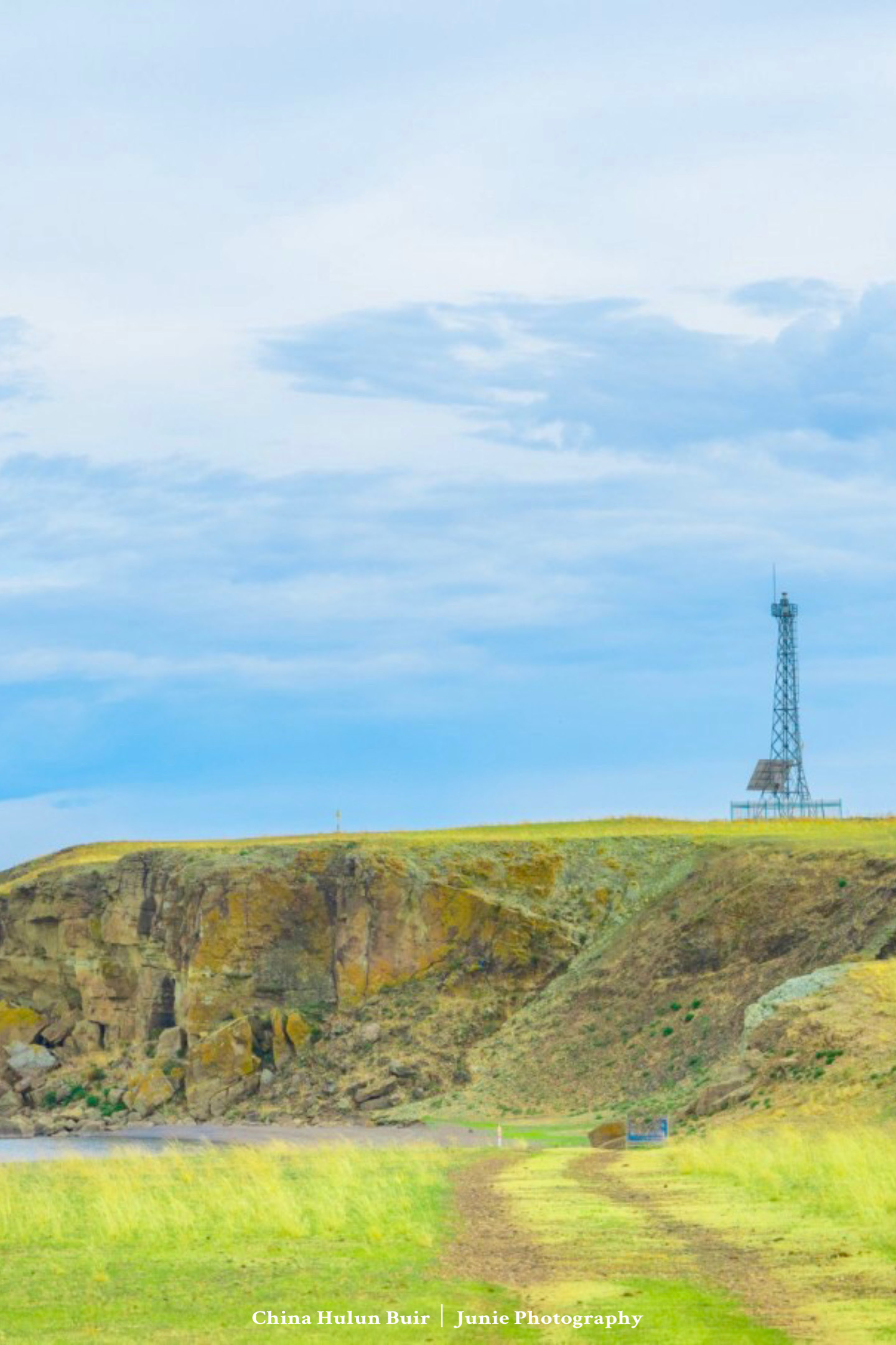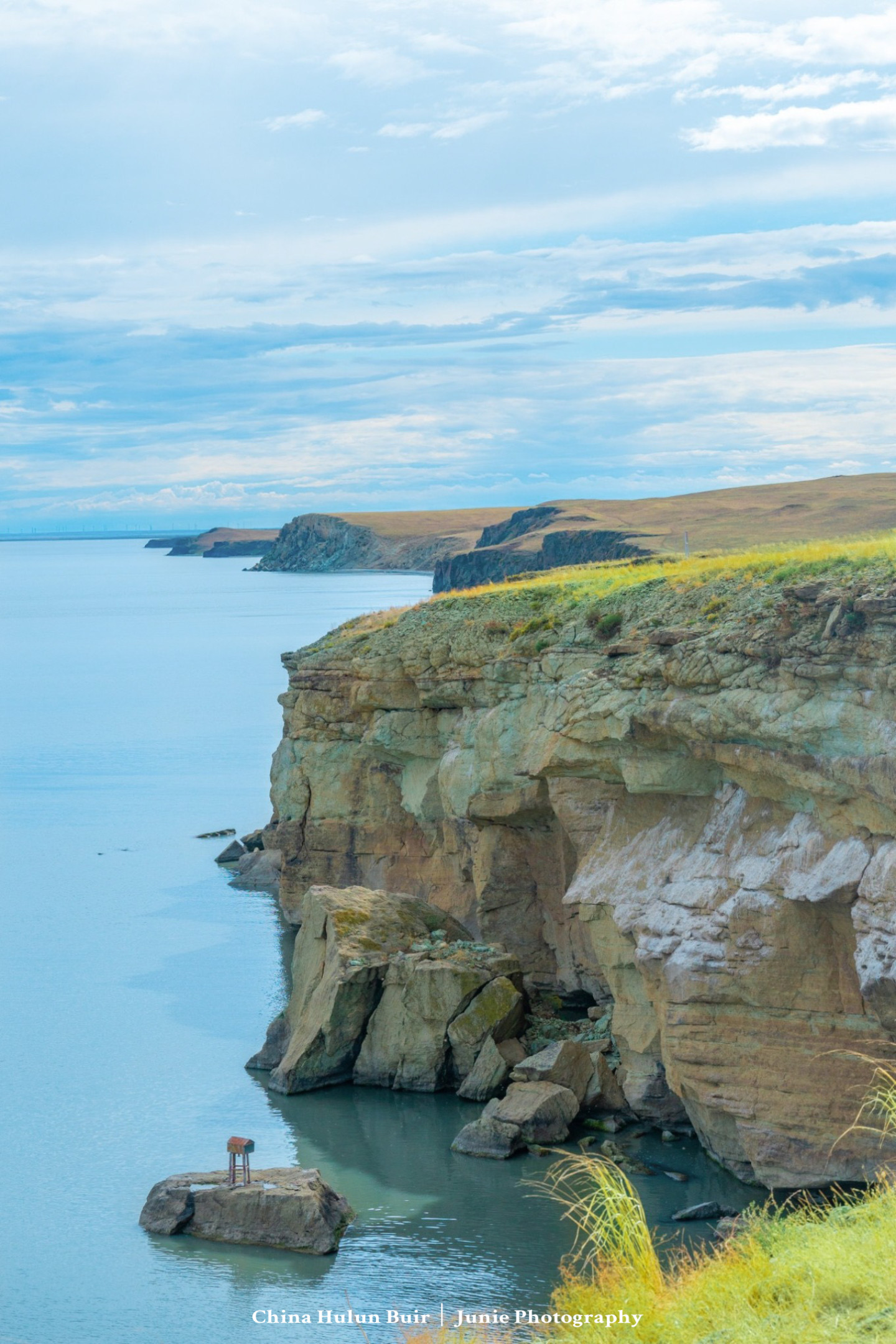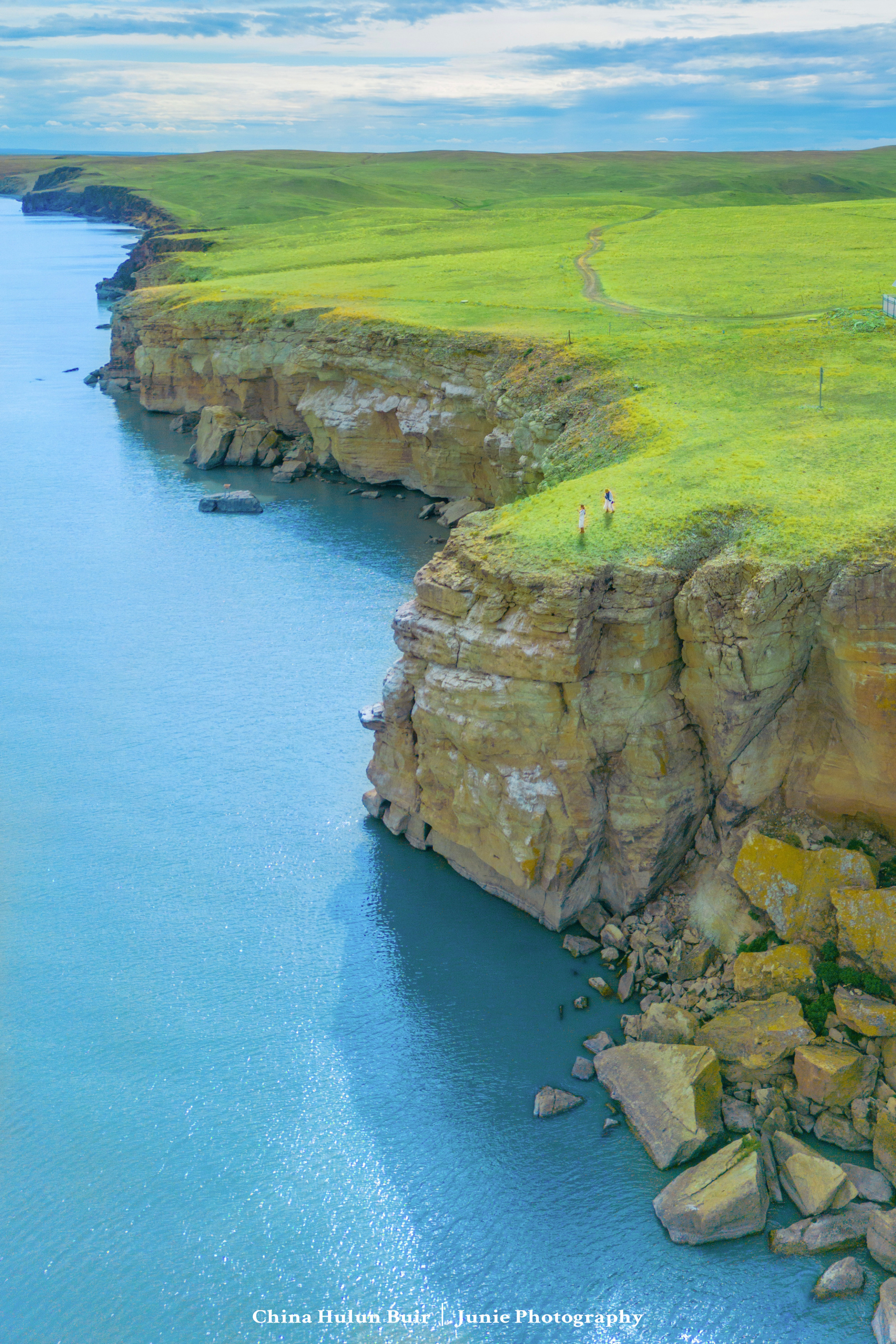 航拍虽震撼,但也狠修了!遇到蓝天白云的话,呼伦湖的确非常蓝而透彻,但悬崖上的草原依然是黄绿黄绿的。