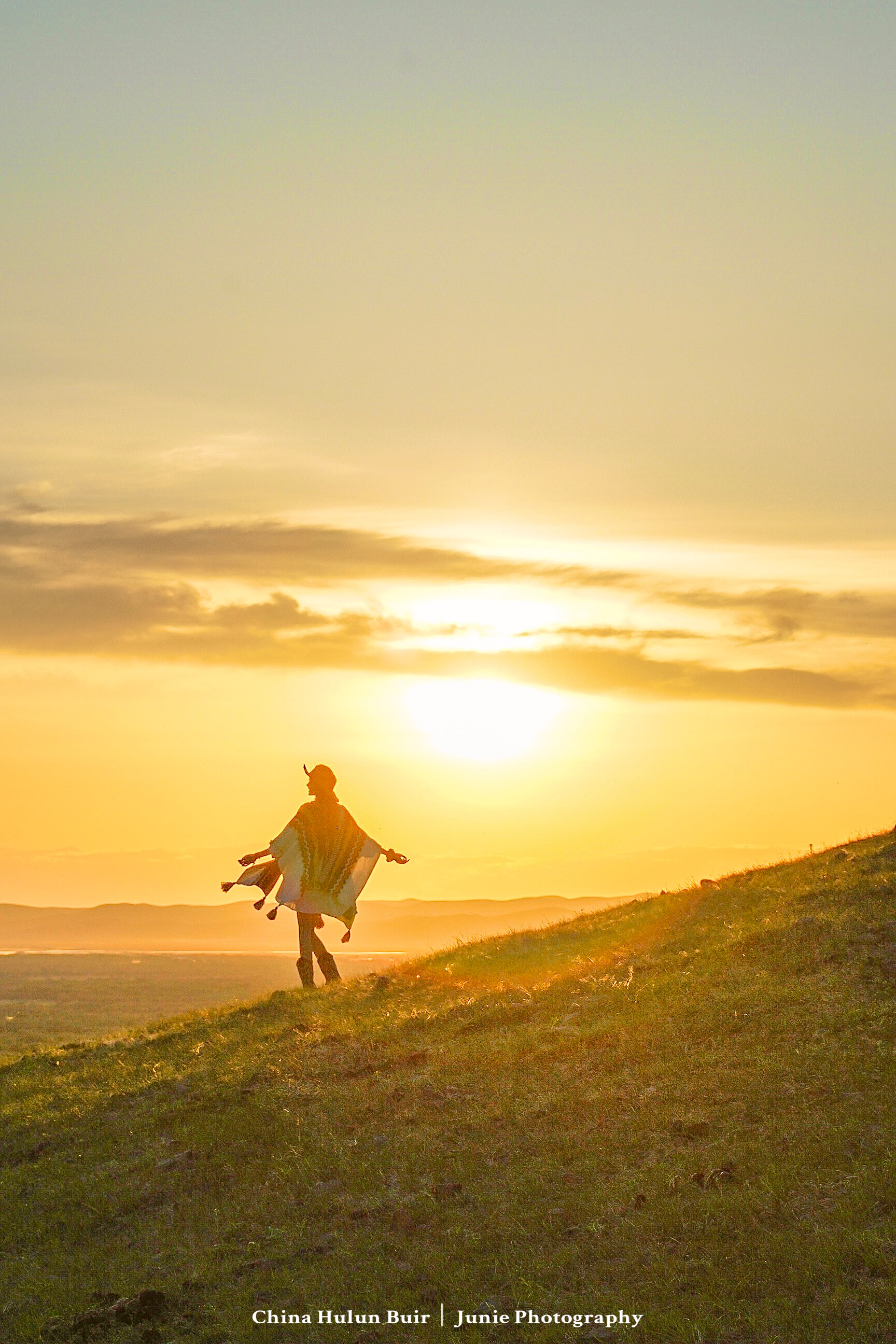 绕到后面的山头,是正对落日的山坡!当天很幸运地遇到了漫画里的晚霞,橘黄、金黄变成粉紫,浪漫不已!迎着落日,在山坡上奔跑、转圈,太欢乐啦,电影感拉满!