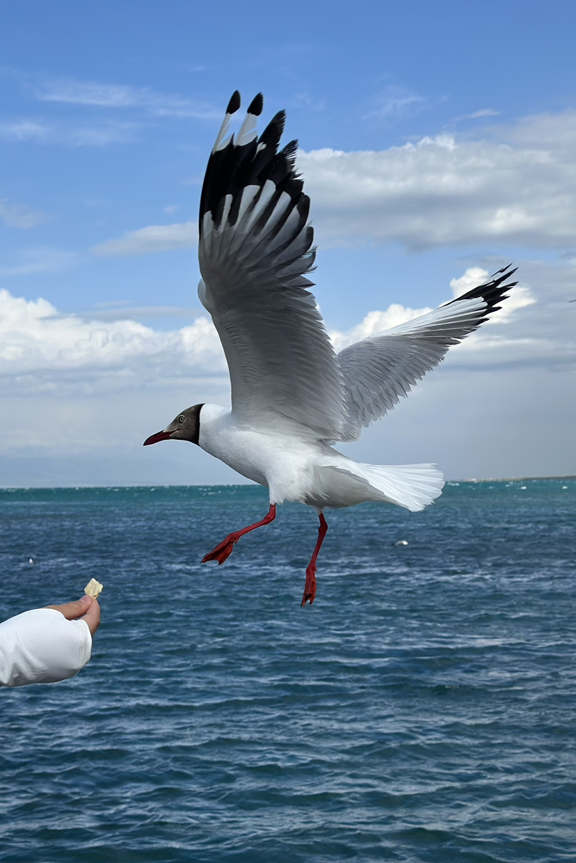 湖水颜色渐变,浅蓝到深蓝,码头那边还有很多的红嘴鸥,可以面包拿在手上它们会来吃。