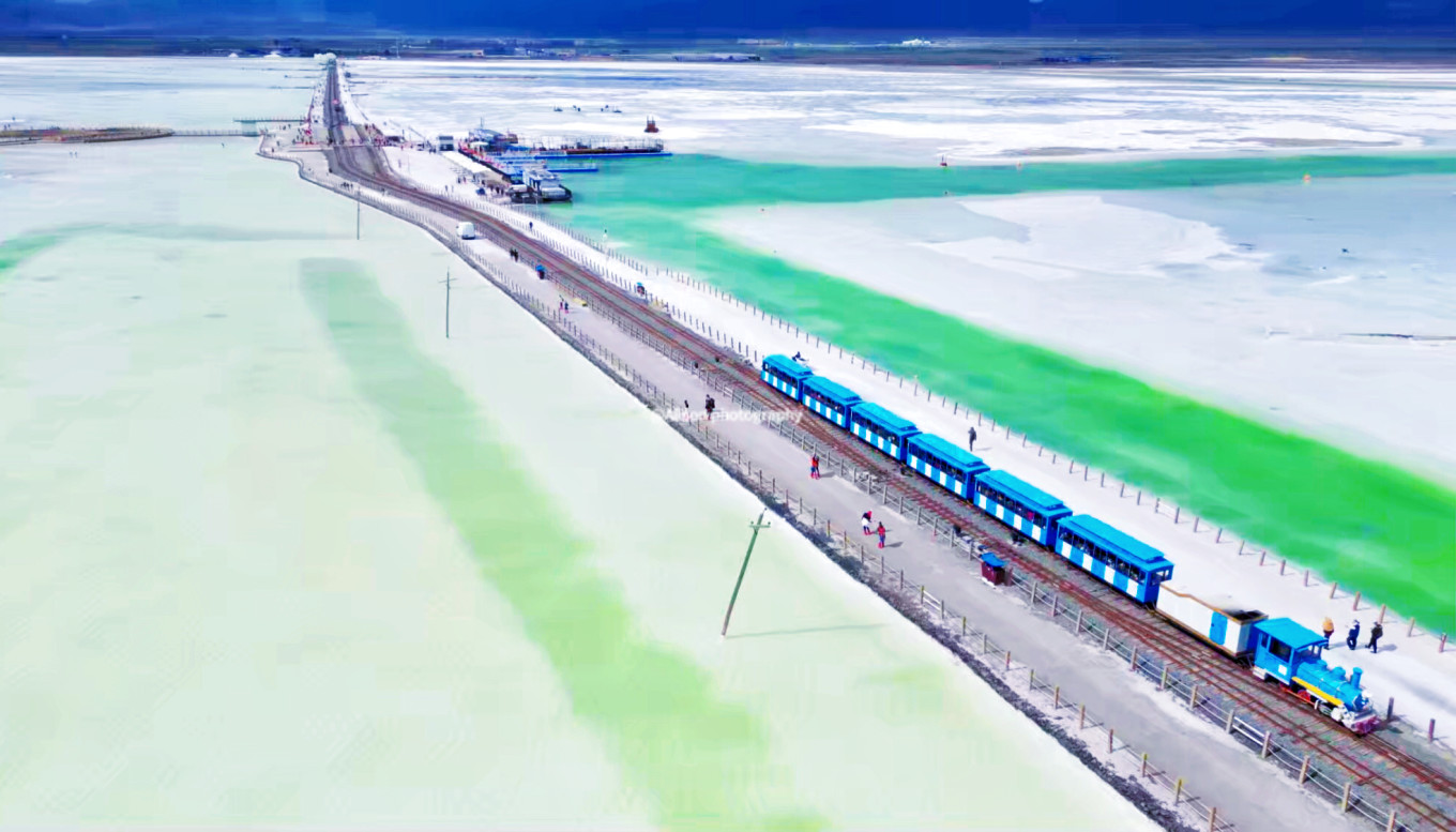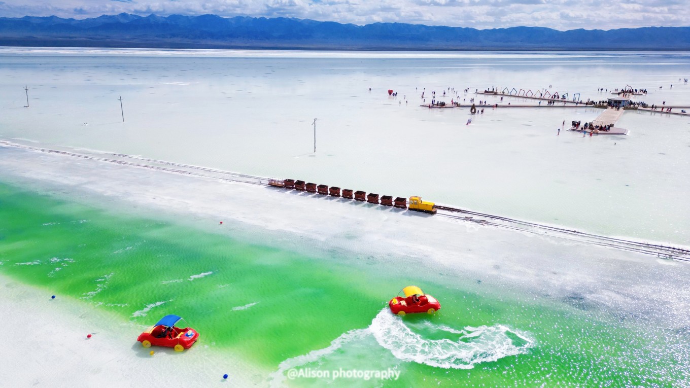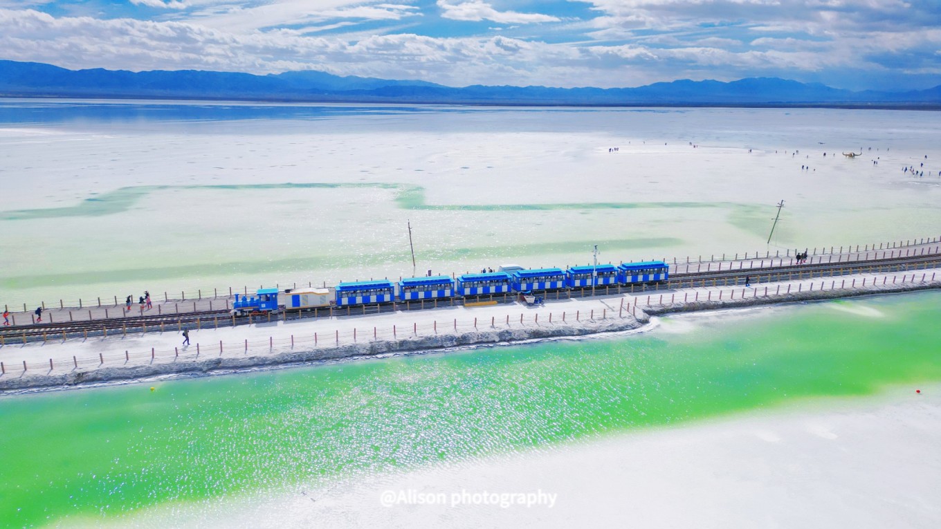 在茶卡盐湖,坐着火车一路前行,体会天与地的纯净
