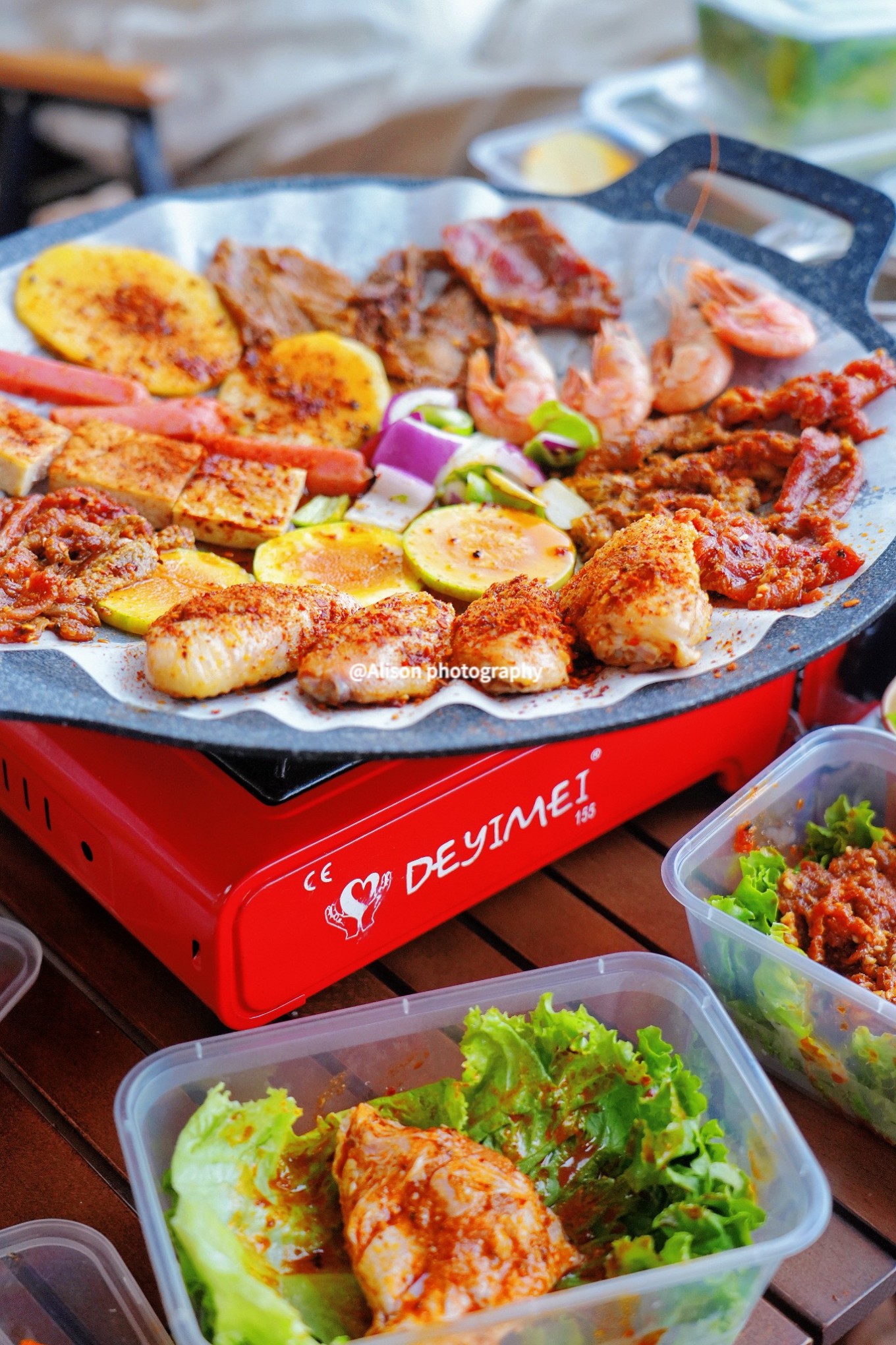 在青海湖边的呷布哒里,大家围炉煮茶,喝着咖啡,吃着甜品水果,晚餐搭配的是热腾腾的火锅和烤肉。我们原本是要入住这里的帐篷,但阴雨天让我们临时改变了计划。