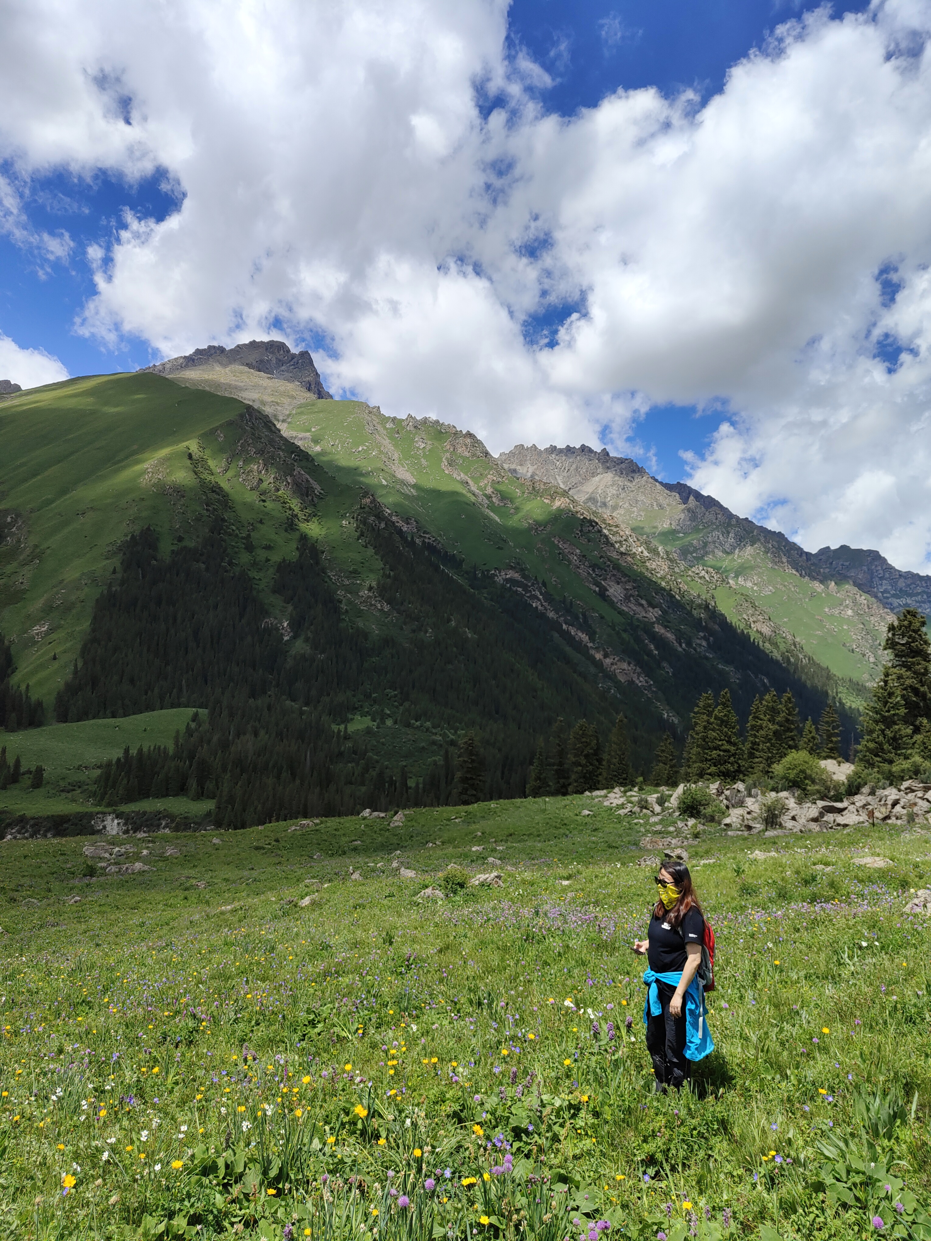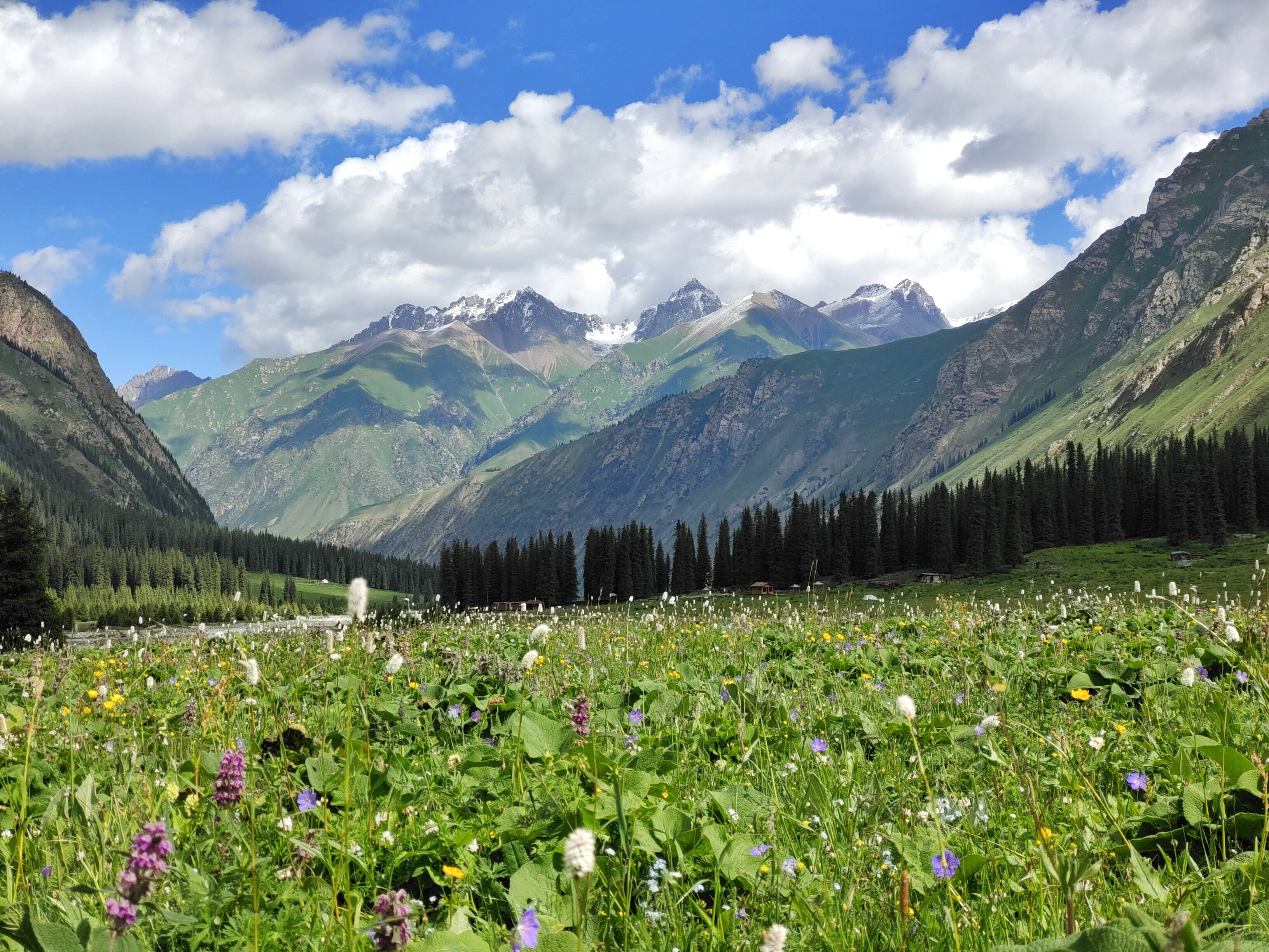 早些将军桥一路上行,就正式进入夏塔景区核心地带了。一路上,只见雪岭云杉遍布,流水淙淙,草原上的野花也开了,好一幅美丽的山水画!