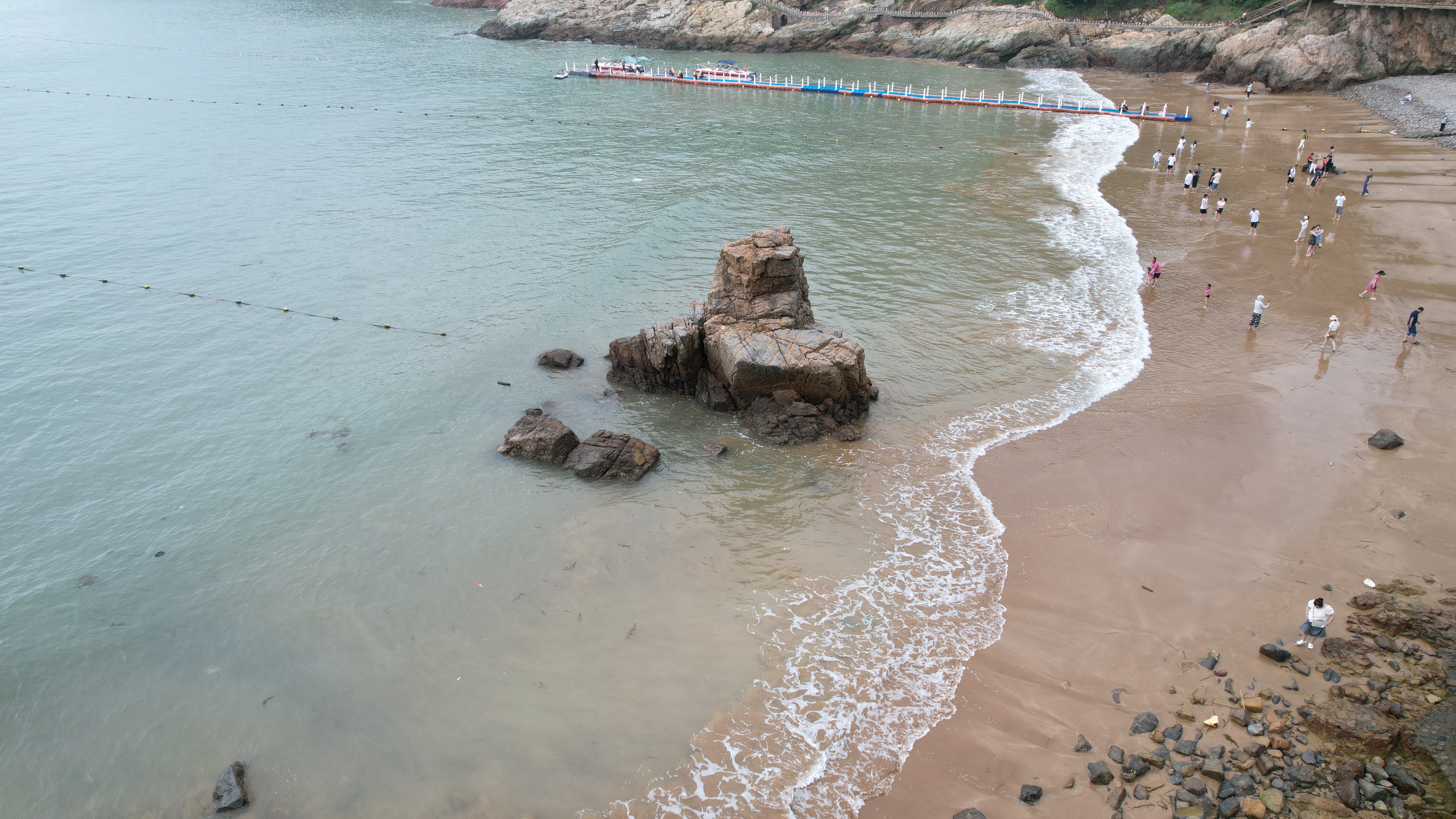 从石滩——沙滩——海水,是个层次分明的海滩。沙滩坡度平缓,海面开阔,海水清澈。沙质为纯净铁板沙,坚硬细腻,踩后无明显痕迹。半环抱浴场的岩石上有环岛栈道,可达南砲台、仙叠岩等景点。