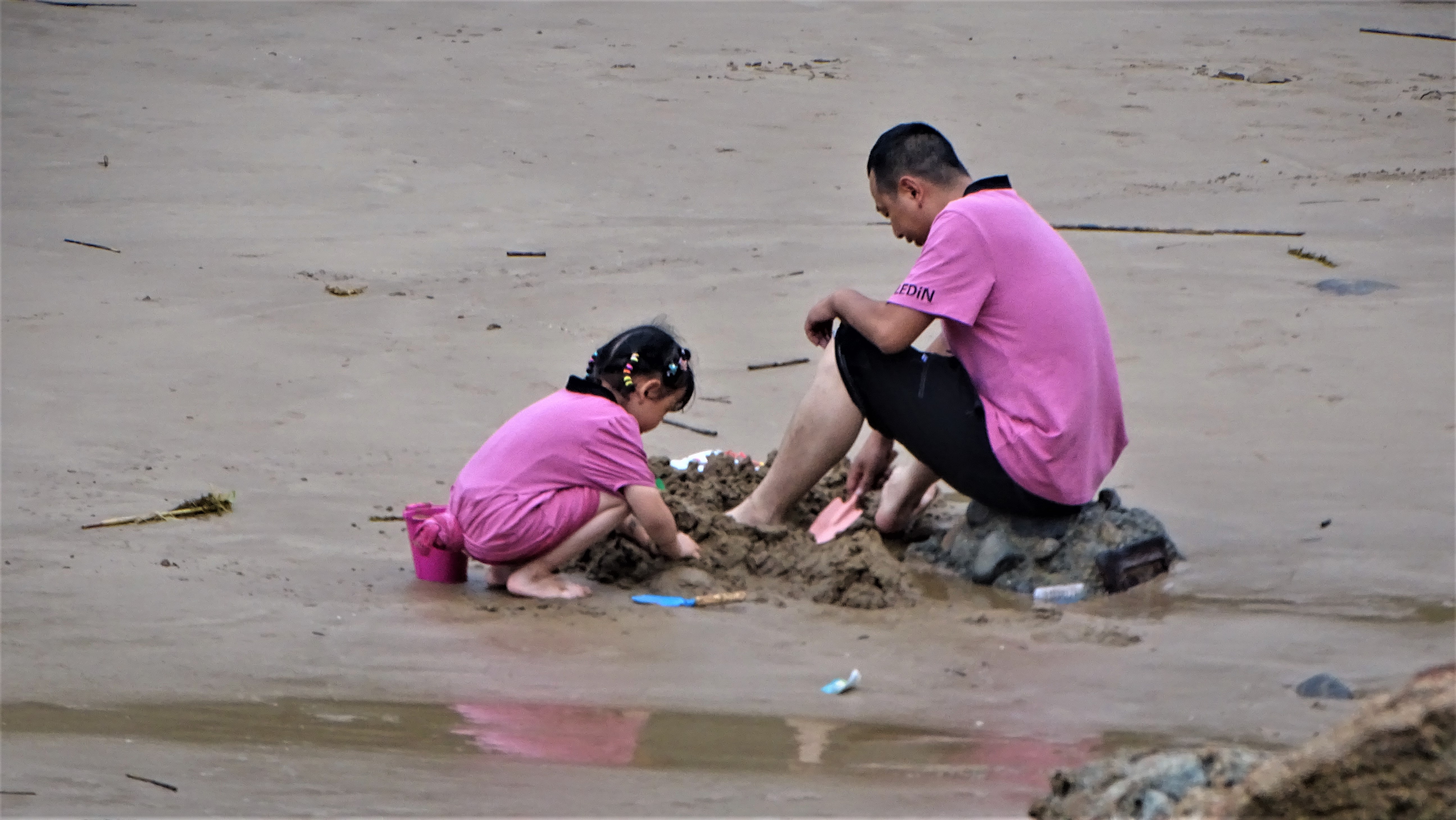 沙滩上的游客。有大有小,还有坐婴儿车的。嬉水、玩沙、游泳、漫步、体验浮动码头和水上快艇,各取所爱。