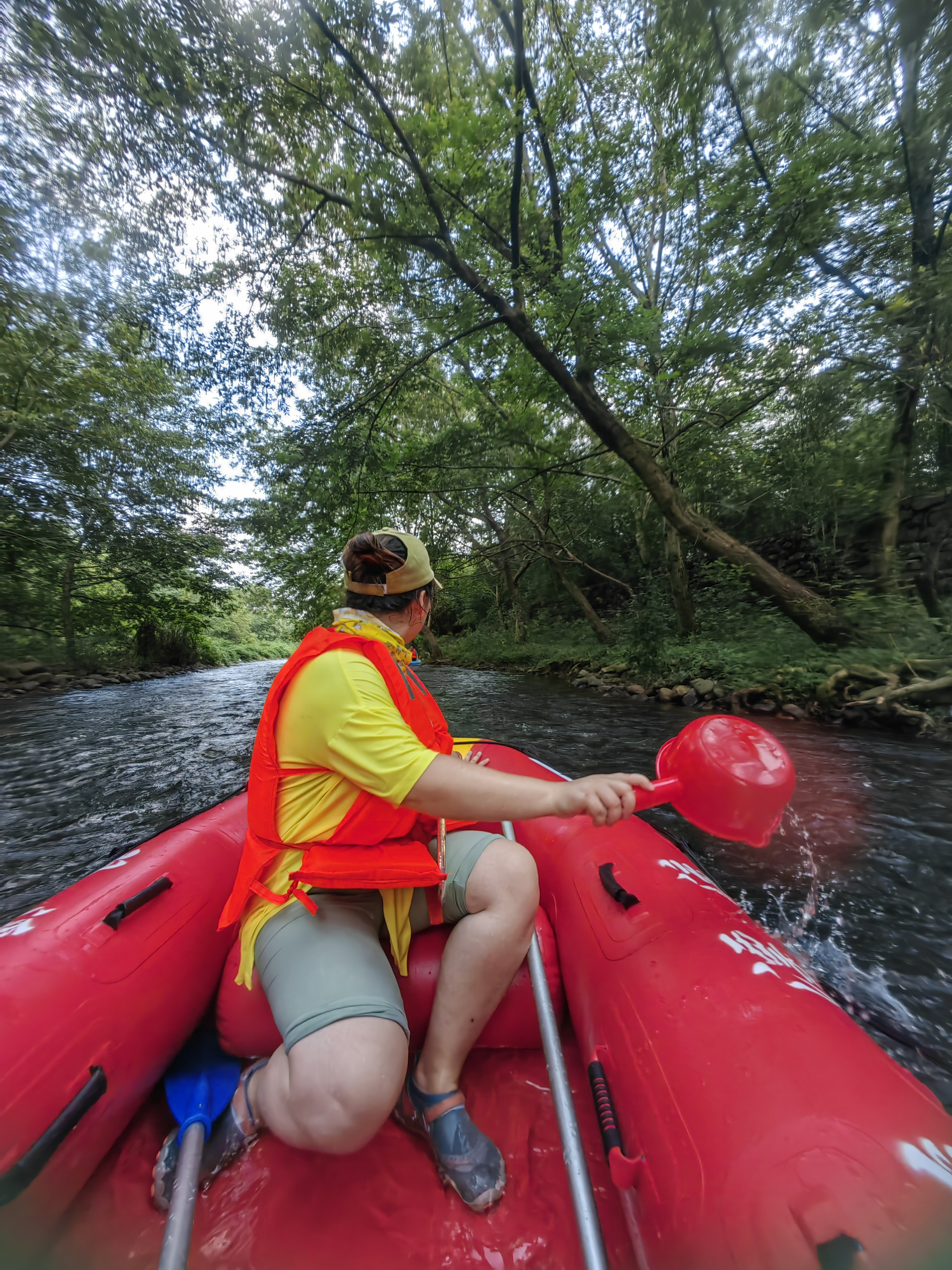 下午一点半,大家集合出发前往双溪漂流,漂流点距营地约2.5公里,开车10分钟左右。到达后开始排队等待乘坐景交,排队+乘车约半小时时间,到达漂流起点领取救生衣后,既开始了漂流行程。