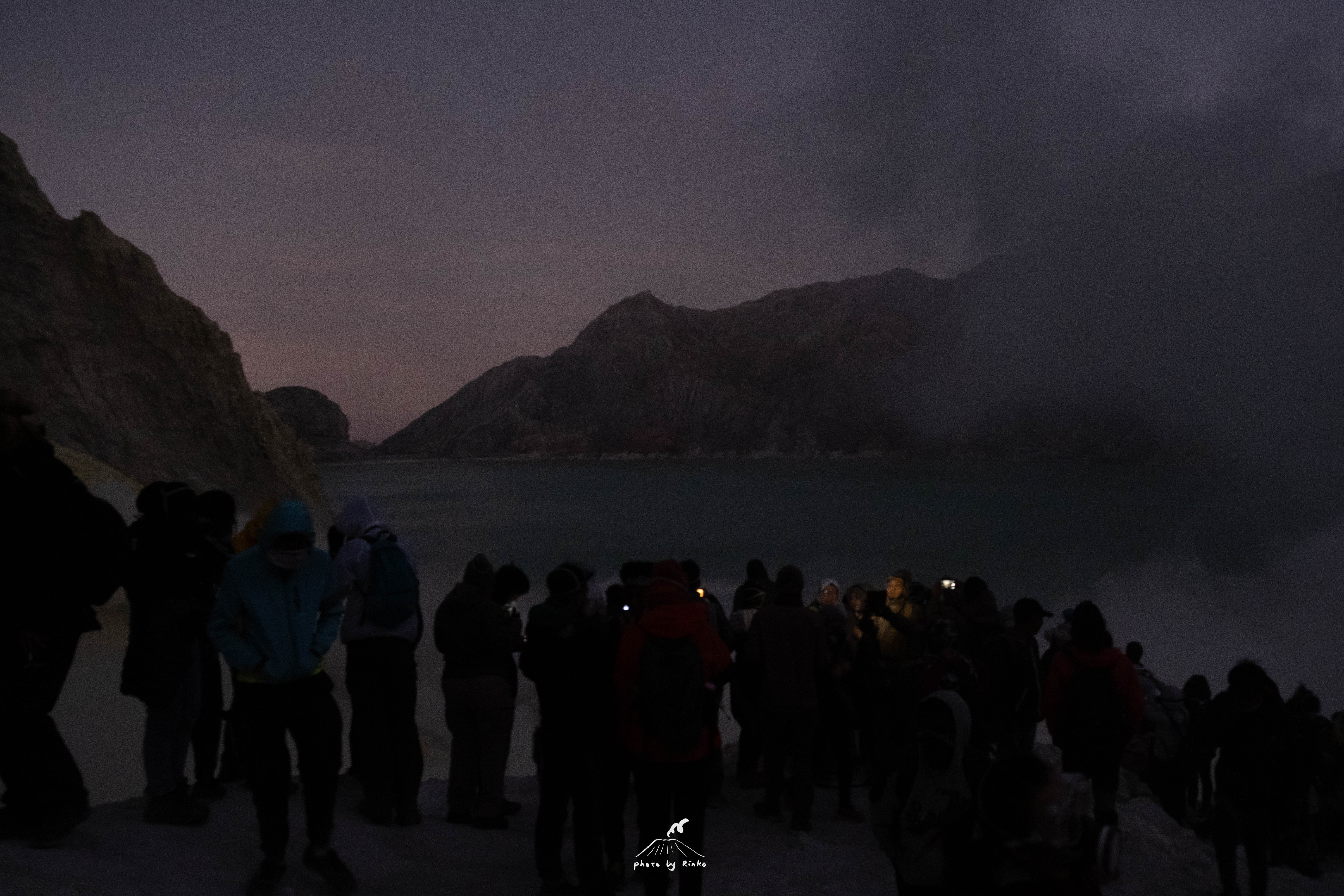 我们在山坡上等待一场火山的日出,从未见过的火山池水是梦幻的TIFFANY蓝,唯美得不像话,不停地冒出淡黄色的硫磺雾气,向周围弥散着,空气里是难闻的臭鸡蛋味(其实就是硫磺的味道)。