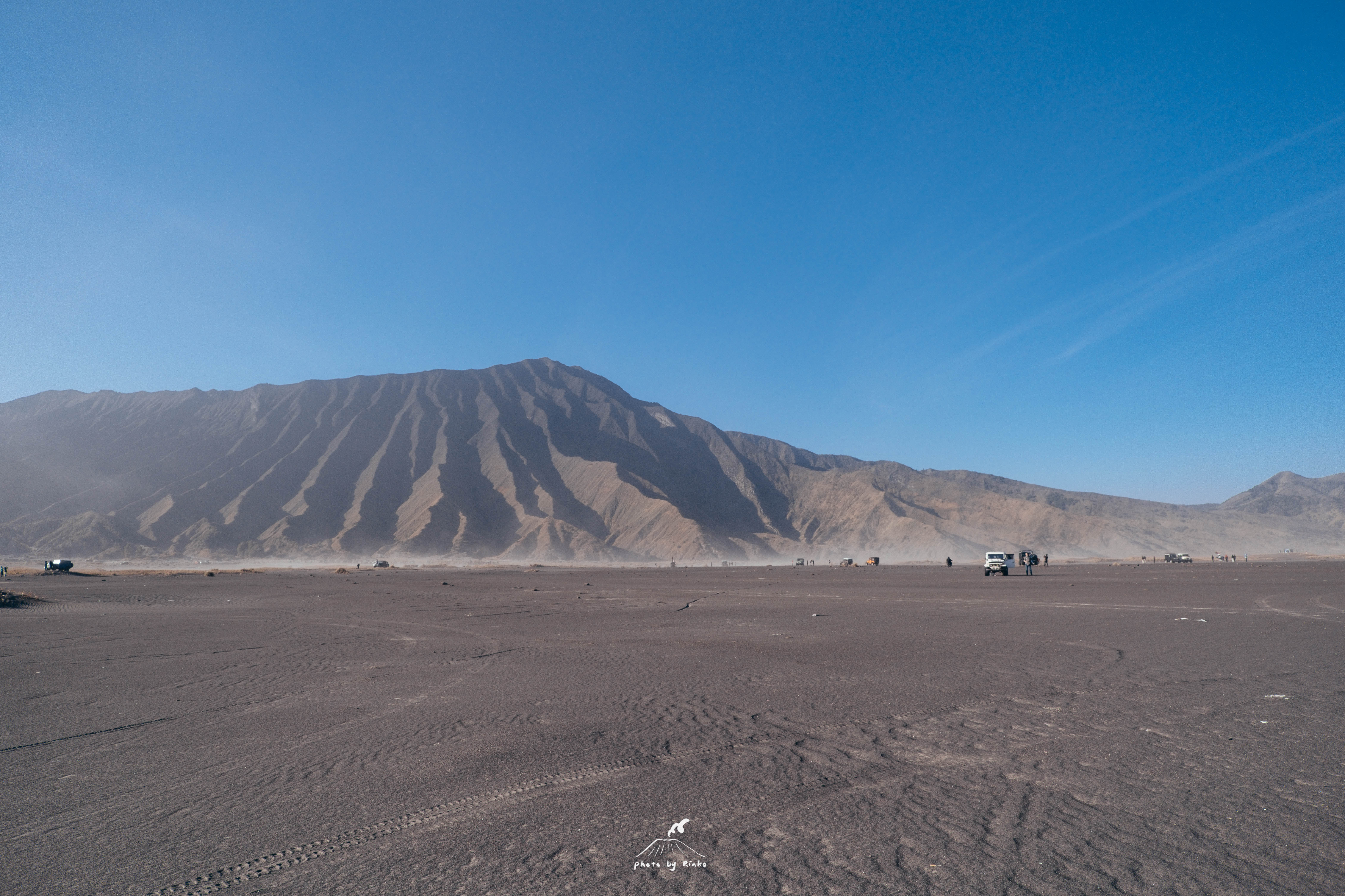 下山以后我们继续去揭开Bromo的面纱,观景台是在俯视的角度观看它,接下来我们要骑马去爬上Bromo,到达山脚下,我们把车停下,拍了几张“汽车广告”,火山做背景实在是泰裤辣!不过风沙过大,每次拍摄都要做3秒钟的心理建设,沙尘漫天如同面临着地球末日。