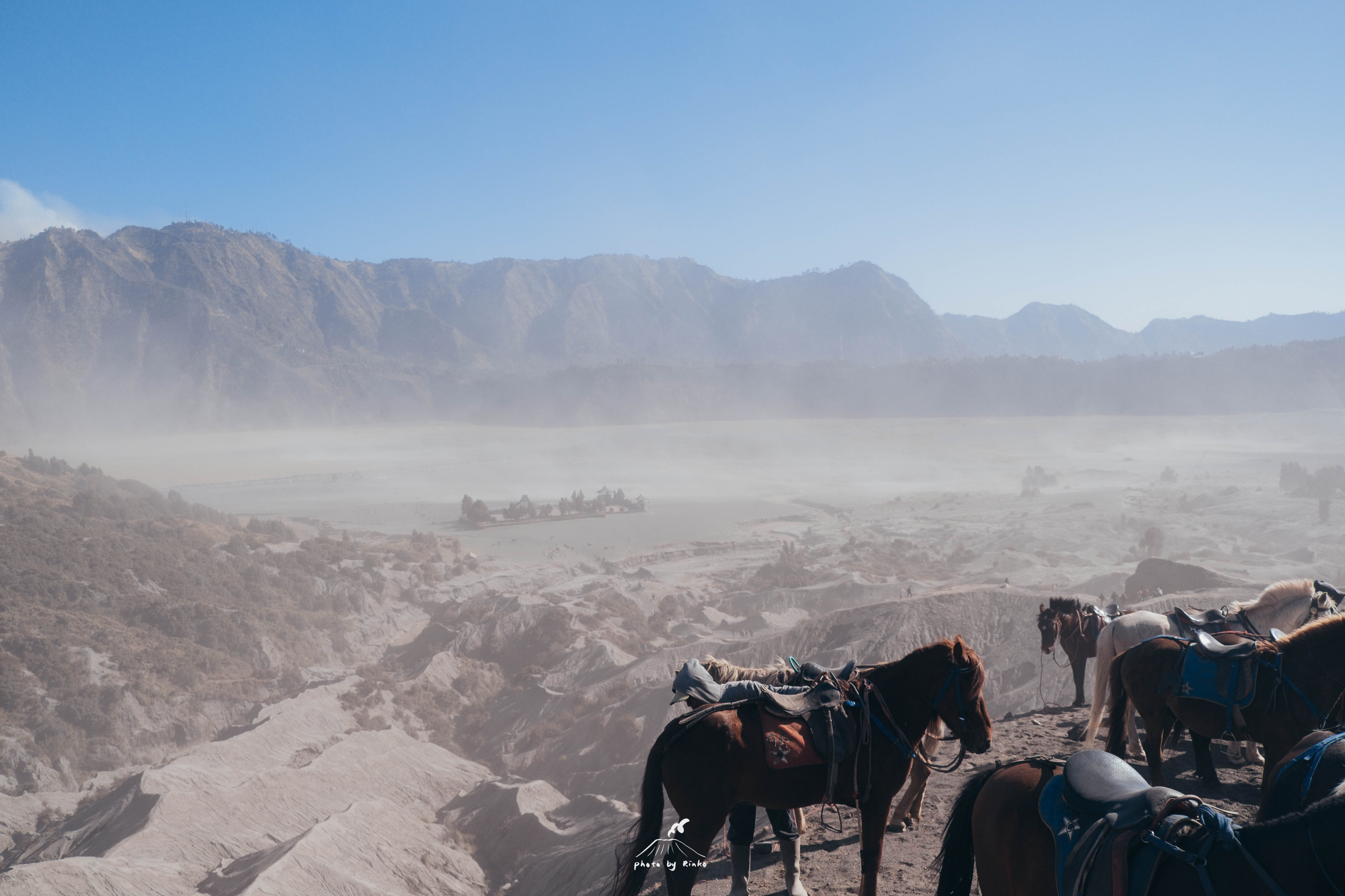 布罗莫也是印尼诸多火山中最容易攀爬的一座,最后一段路我们要步行上山,好在并不是很远,阶梯是沿着火山修建的,所有的马都在这里休息,爬上火山还能看到冒着“热气”的火山湖,天哪!我真的看到了,这么近距离,巨大的喷口冒着灰白的烟雾,似乎积攒着无穷的可怕能量,令人望而生畏。人类在自然面前渺小得不值一提。