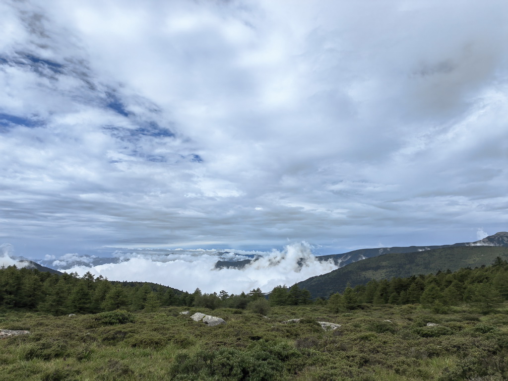 听领队和接待站老板说今天是天晴,定了早上的闹钟,结果还是小雨中,于是继续睡觉,早上7点在接待站吃了一顿很贵的早餐后便开始了第二天的行程,雨已停,远处的云漂浮在山间,看着美景,呼吸着新鲜空气,心情超爽!